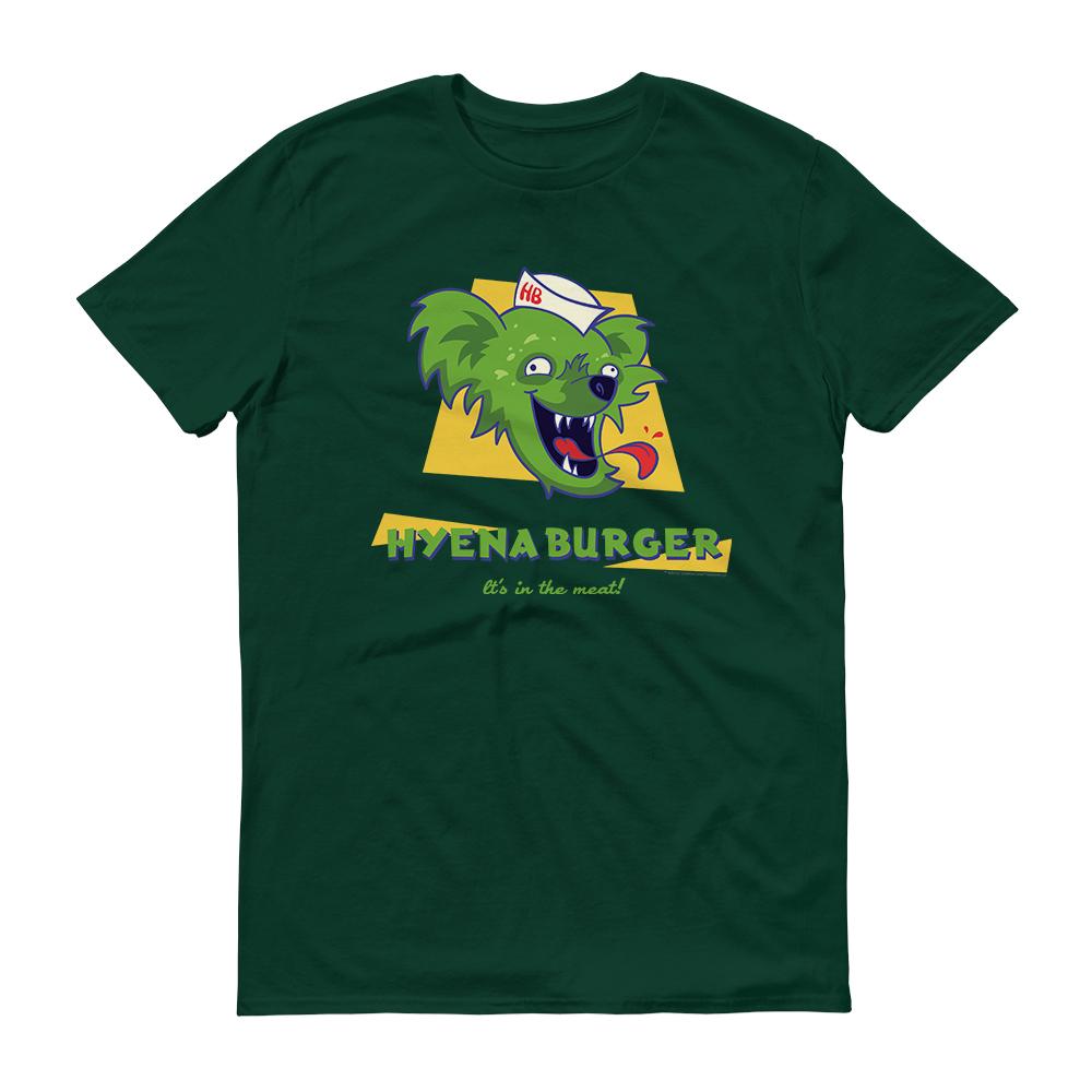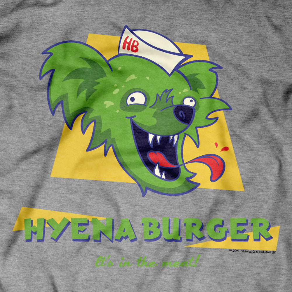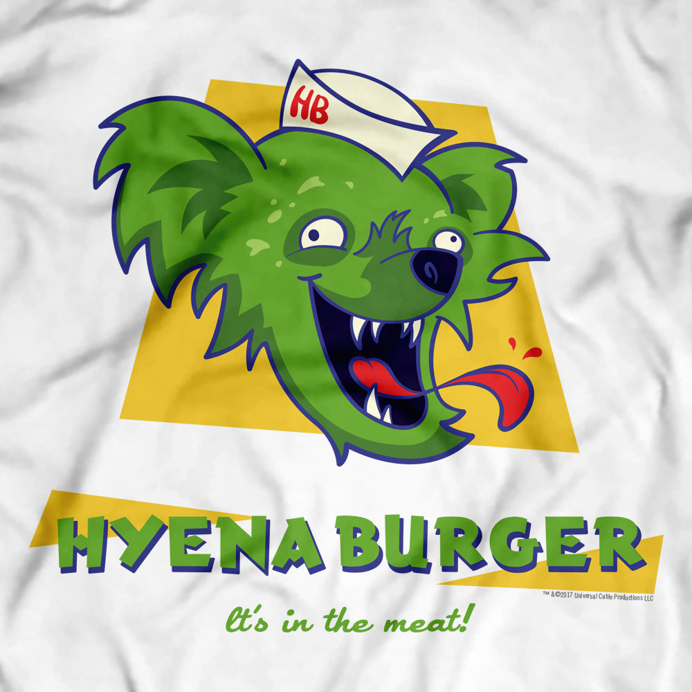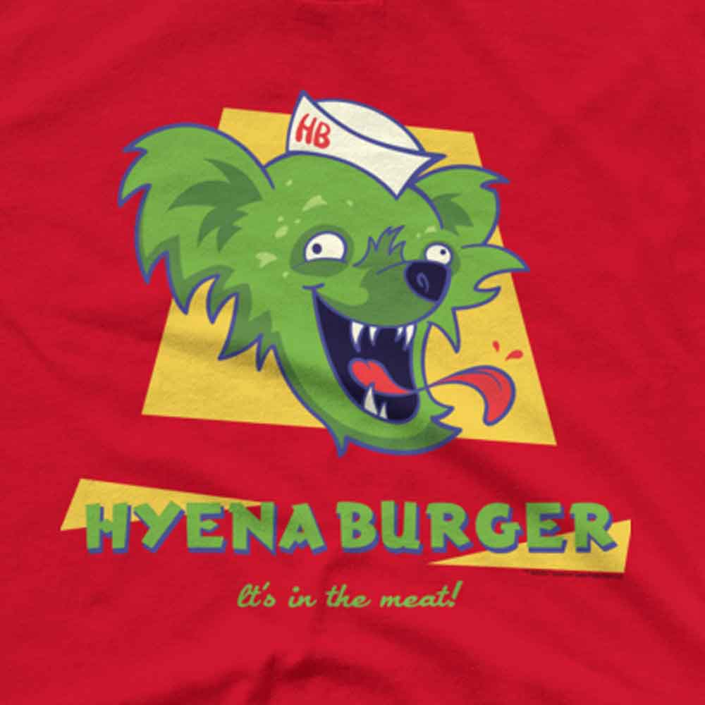 Your new favorite fast food option. The Hyena Burger - it's in the meat. This 12 Monkeys t-shirt has the Hyena burger logo on the front so you can let everyone know what your favorite food is.
