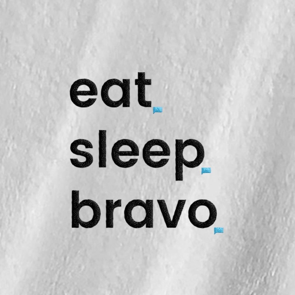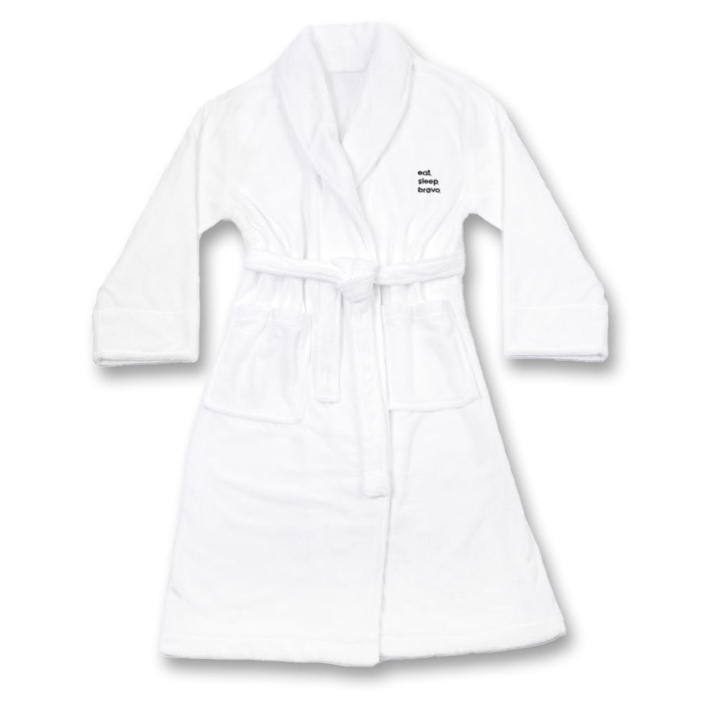Get ready to eat, sleep, and relax in the most Bravolicious robe yet. Made of 100% cotton, this unisex Eat. Sleep. Bravo Robe is perfect to lounge around in as you watch your favorite Bravo series. Featuring two pockets on each side and Eat. Sleep. Bravo. on the upper-left chest, this robe will make you feel like Bravo royalty.