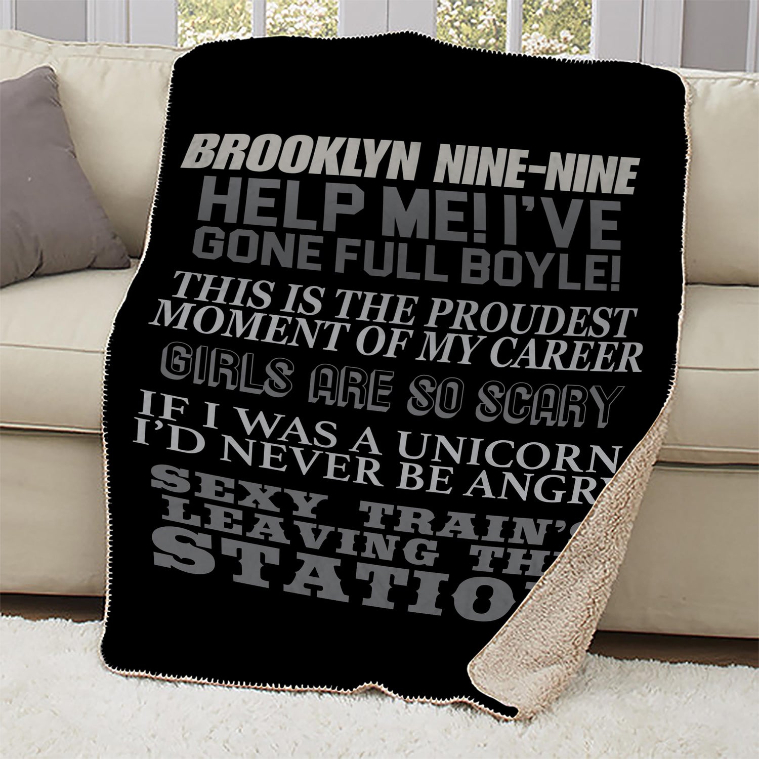 This soft and smooth blanket is a must-have for true Brooklyn Nine-Nine fans! This sherpa blanket features the most memorable quotes and episodes of all time! From This is the proudest moment of my career to Help me I've gone full Boyle and If I was a Uniicorn I'd never be angry this blanket says it all. Snuggle up and watch Brooklyn Nine-Nine underneath this cozy throw!PRODUCT DETAILS:
