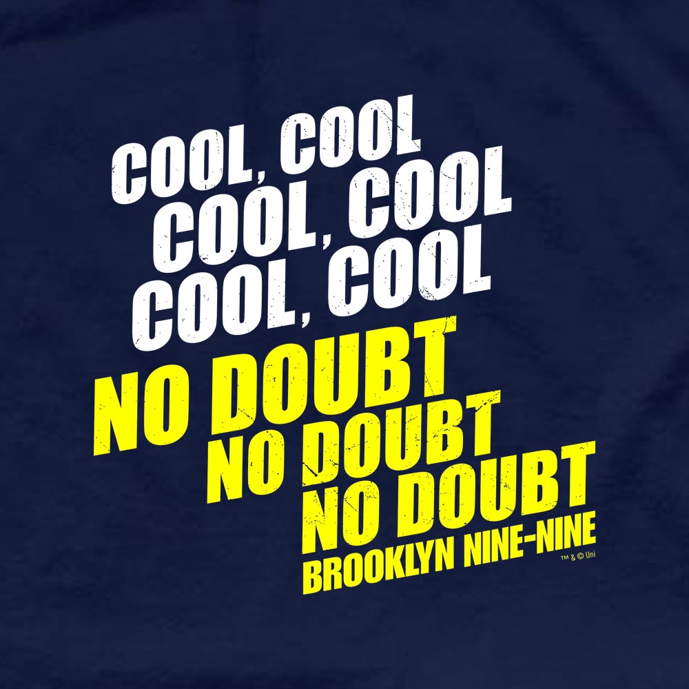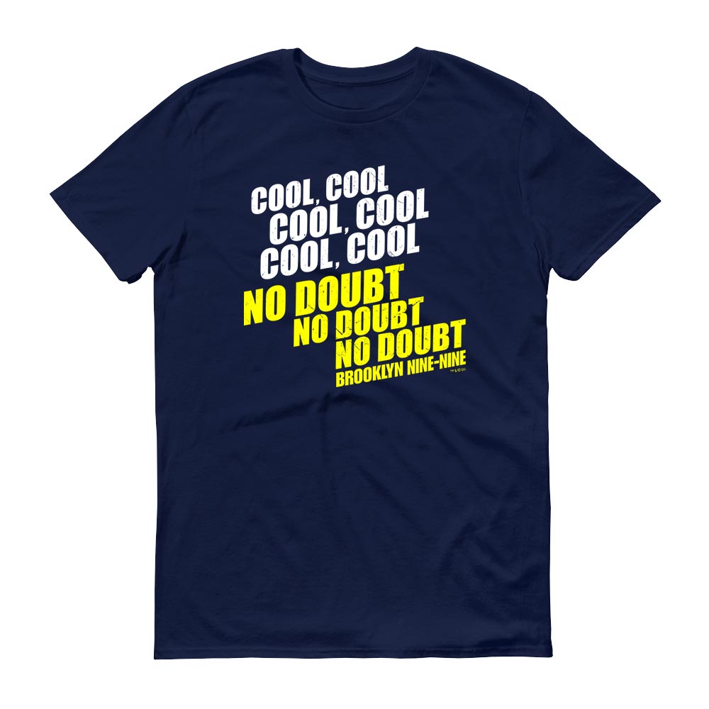 Fan for Detective Jake Peralta with one of his famous funny lines. This men’s t-shirt featuring “cool cool cool cool cool cool no doubt no doubt no doubt” will be recognized by any fan of Brooklyn Nine-Nine. Get this short sleeve tee to represent your favorite carefree Brooklyn detective.This shirt features short set-in sleeves and a seamless rib knit collar. There are taped neck and shoulder seams for durability and two-needle hemmed sleeves so the bottom won't unravel.