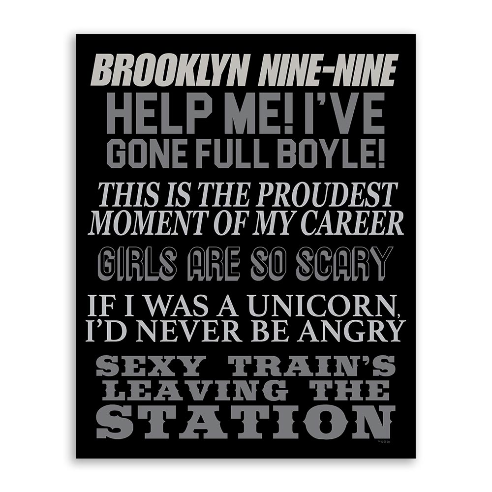 The Brooklyn Nine-Nine Mash-up Poster has arrived! This poster features some of the most memorable and iconic quotes from the series. This poster has all of the quotes a die-ard fan could want including: If I was a Unicorn I'd never be angry This is the proudest moment of my career Girls are so scary and much more! Take a trip to Brooklyn and relive your favorite moments from Brooklyn Nine-Nine with a purchase of this poster!PRODUCT DETAILS: