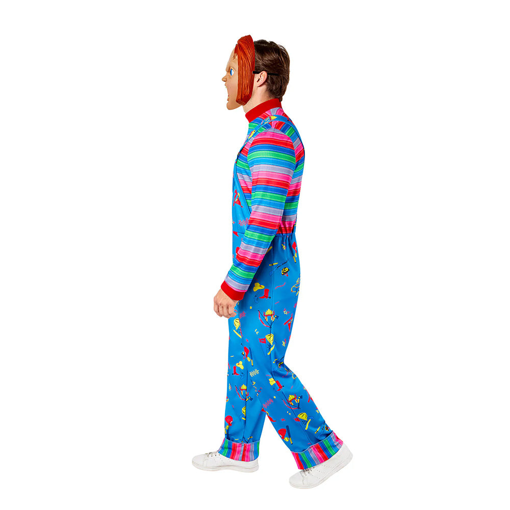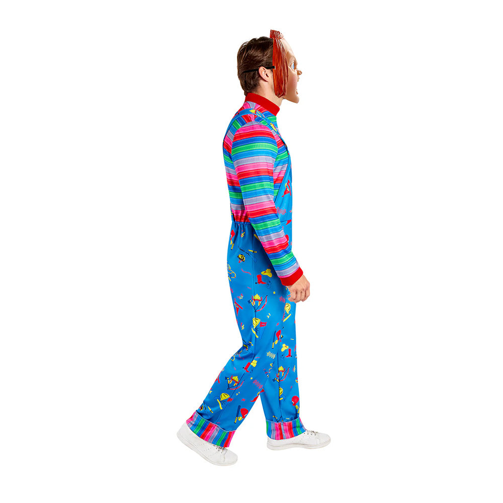 The murderous tendencies will run deep in you this year when you pick up our Men's Child's Play 2 Chucky Costume with Mask. Although Chucky may appear just like a regular harmless doll, he is imbued with the spirit of an infamous serial killer, and cannot control his sinister ways. Even as a doll, Chucky contains beyond human strength, pulling off incredible feats even with his tiny doll body. While you're dressed up as Chucky, you'll be telling all your friends tales of your wicked adventures and all the terrible things you've done to your unfortunate victims. With this set, you will receive everything you need to become your favorite horror movie villain. Featuring a blue Good Guy overalls jumpsuit with the matching evil Chucky mask with bright red hair, it's no question that you'll be causing lots of trouble this year while all decked out in this creepy doll outfit. Pair this costume with a matching Chucky knife from our site, and you'll be all ready to go on a killing spree. Pick up your Chucky costume and mask today!