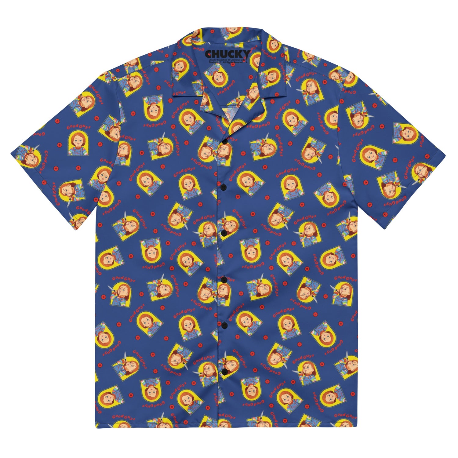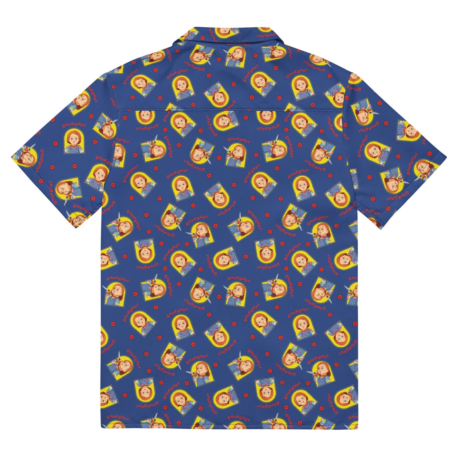 Introducing the Chucky Good Guys Pattern Button-Up Shirt: A playful and nostalgic tribute to the iconic character that has been captivating audiences for decades. This shirt is a must-have for fans of the classic horror franchise and anyone looking to infuse their wardrobe with a touch of quirky charm.