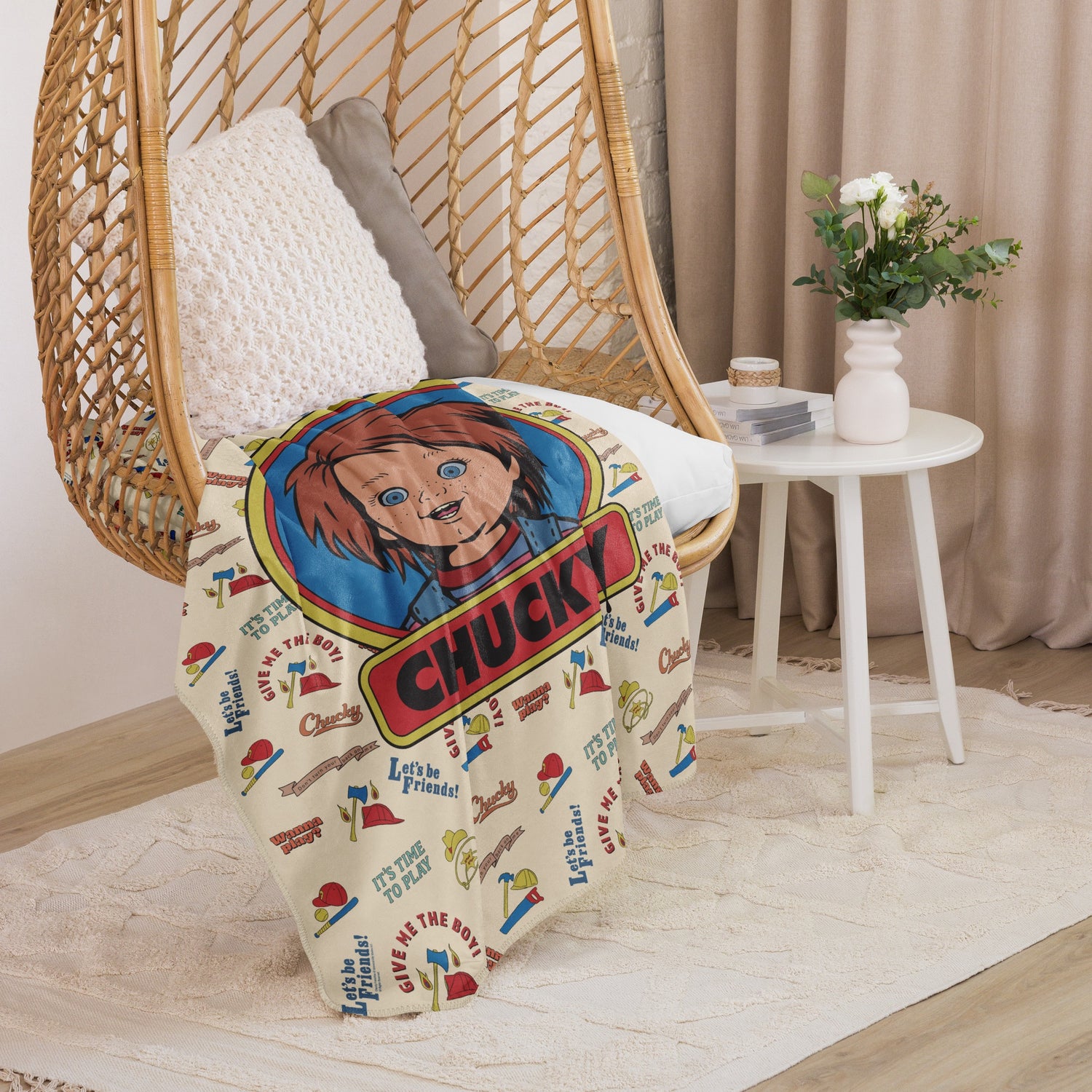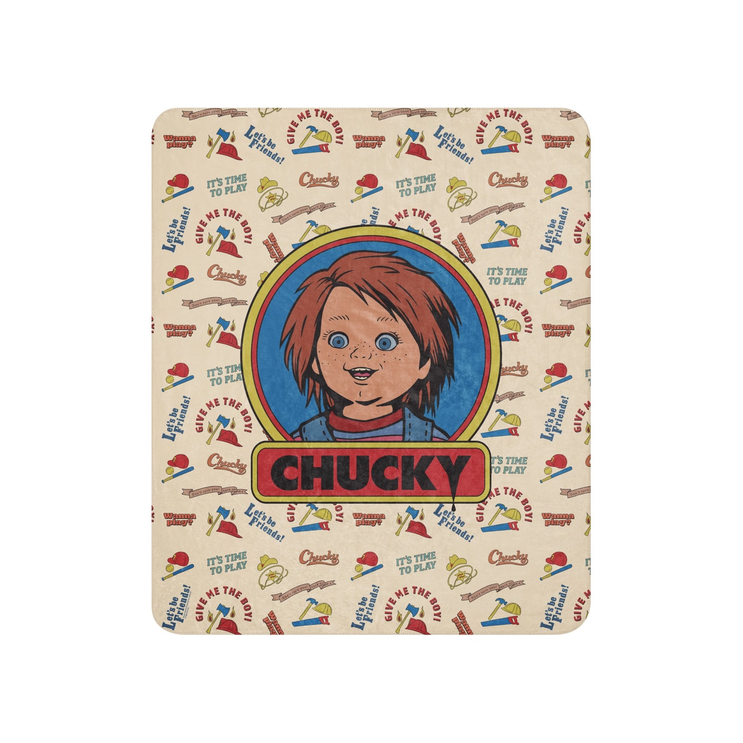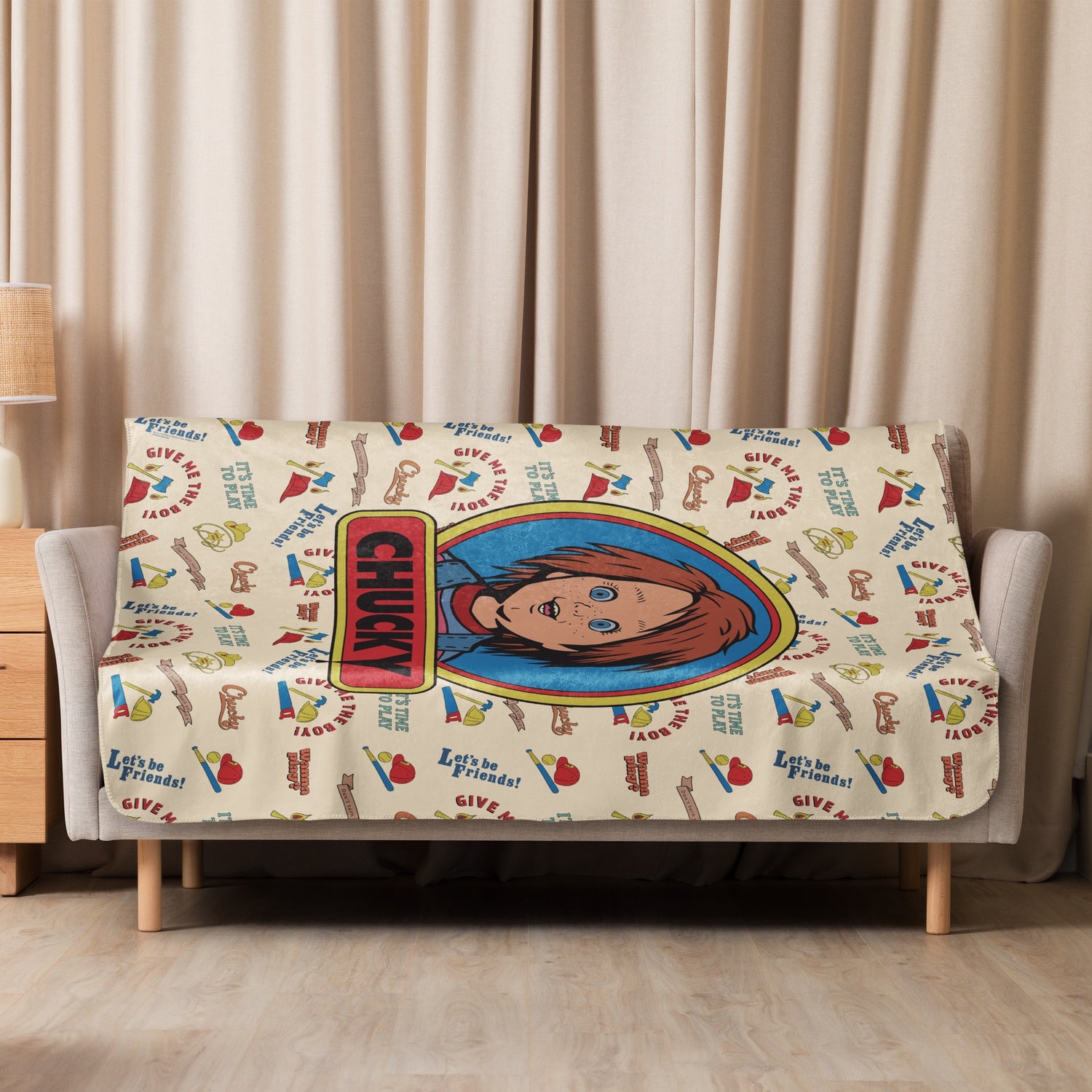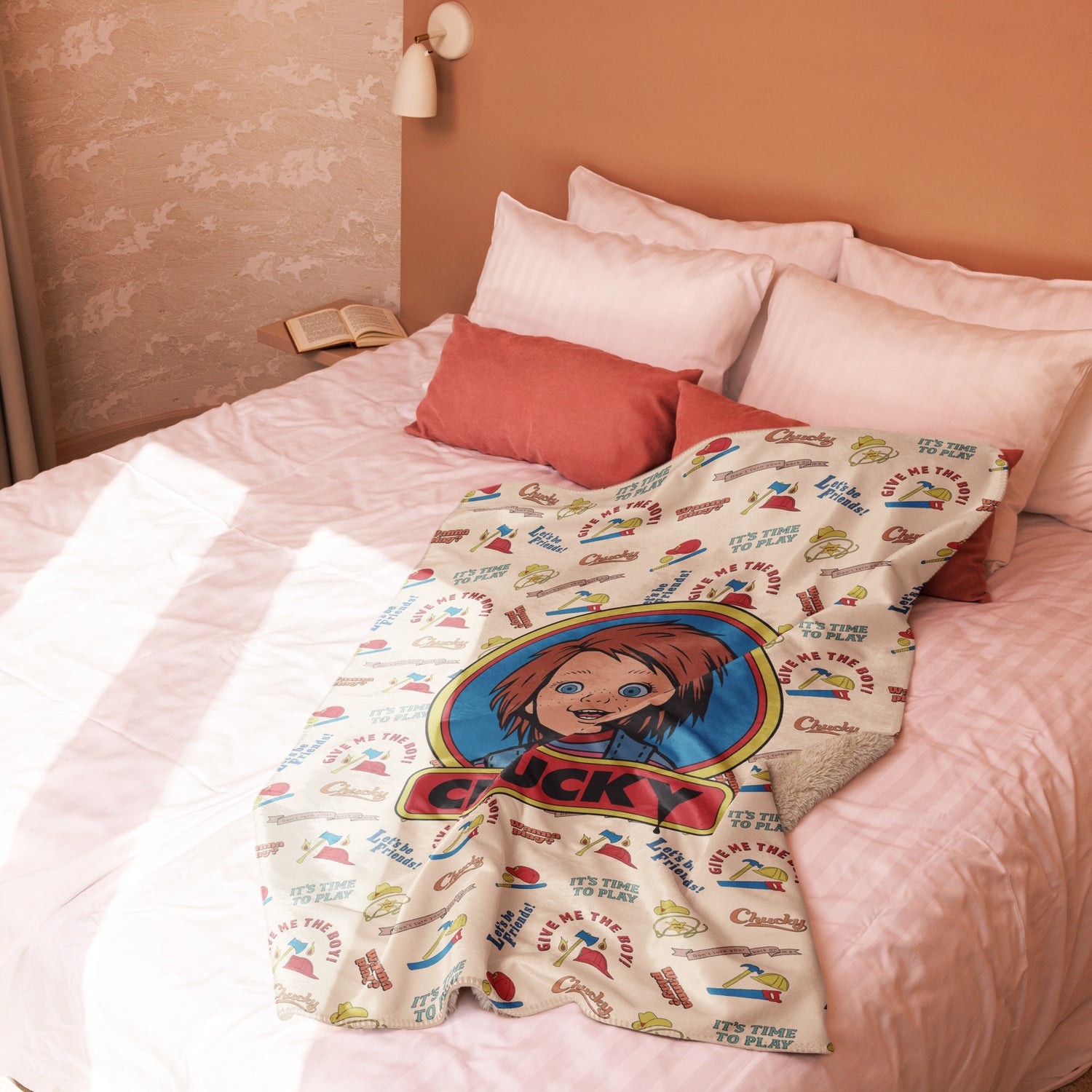 The Chucky Vintage Pattern Sherpa Blanket isn't just a blanket; it's a piece of nostalgia that wraps you in the playful spirit of Chucky. It's the perfect addition to your horror-themed decor or as a thoughtful gift for a fellow enthusiast.