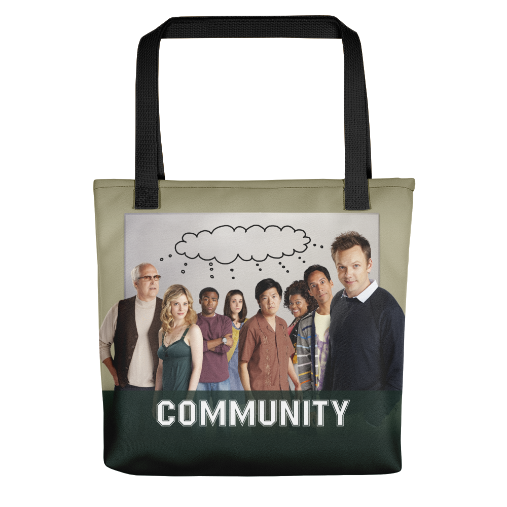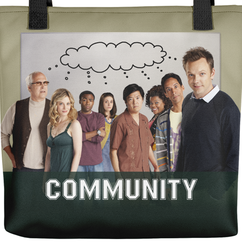 Featuring the cast of Community, this durable Community Cast Tote Bag lets you take Jeff Winger, Abed Nadir, Shirley Bennett, Señor Ben Chang, Alison Brie, Troy Barnes, Britta Perry, and Pierce Hawthorne everywhere you go. Whether you use it as a daily tote or your new gym bag, this tote is a must-have accessory.