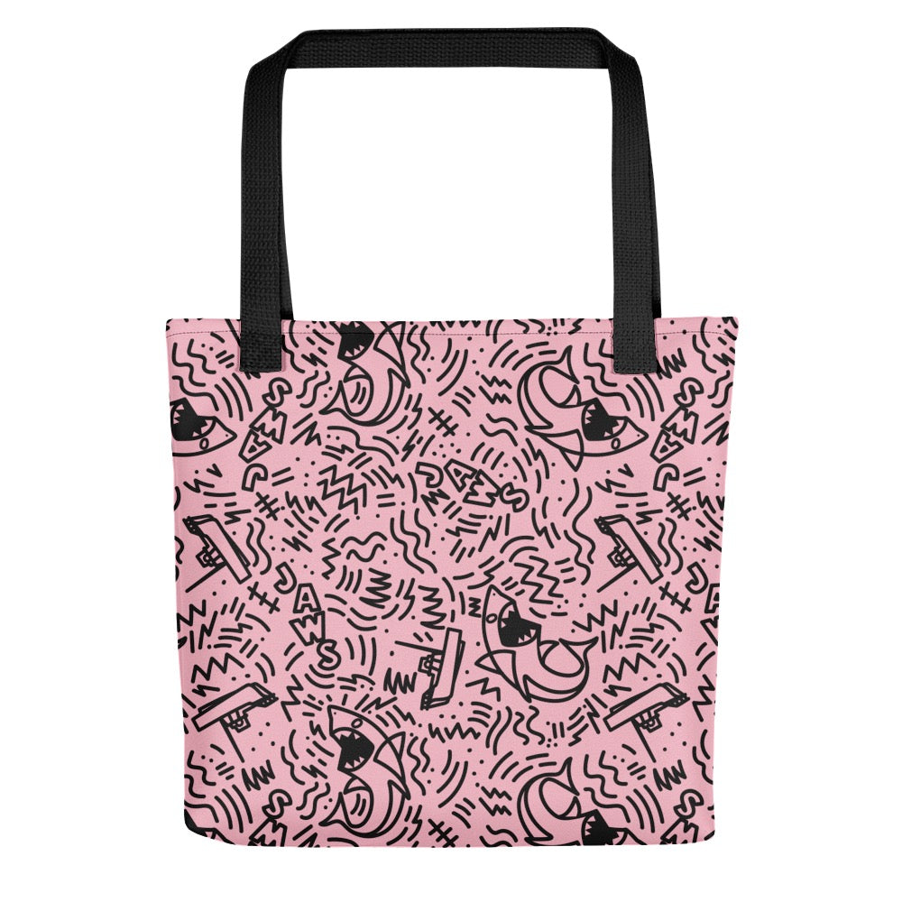 Perfect for work, class, grocery shopping, traveling, the gym, and more, this spacious Jaws Pink Doodle Pattern Tote Bag is the perfect accessory for Jaws fans.