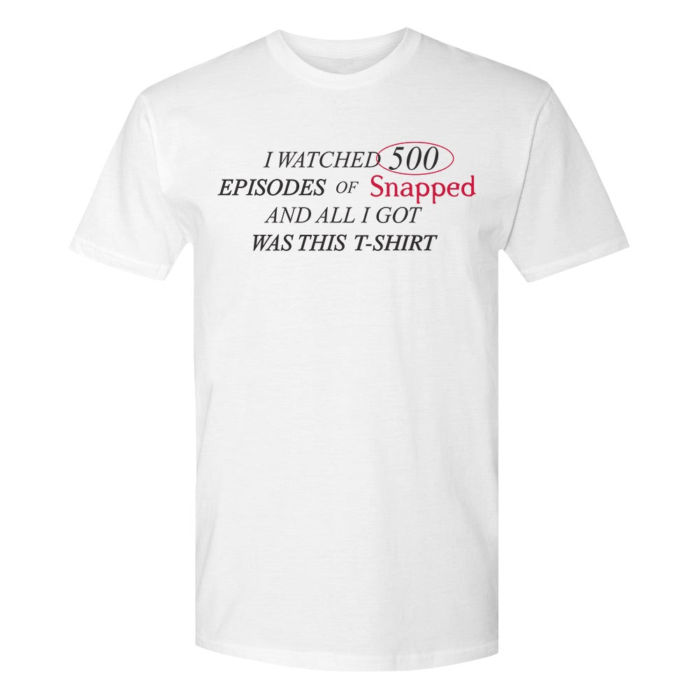 Did you watch 500 episodes of Snapped? Do you want to show off your accomplishment in style? Then this Oxygen I Watched 500 Episodes Crew Neck Adult Unisex T-Shirt was made for you. Comfortable and hilarious, this tee will inspire you to watch 500 more episodes.
