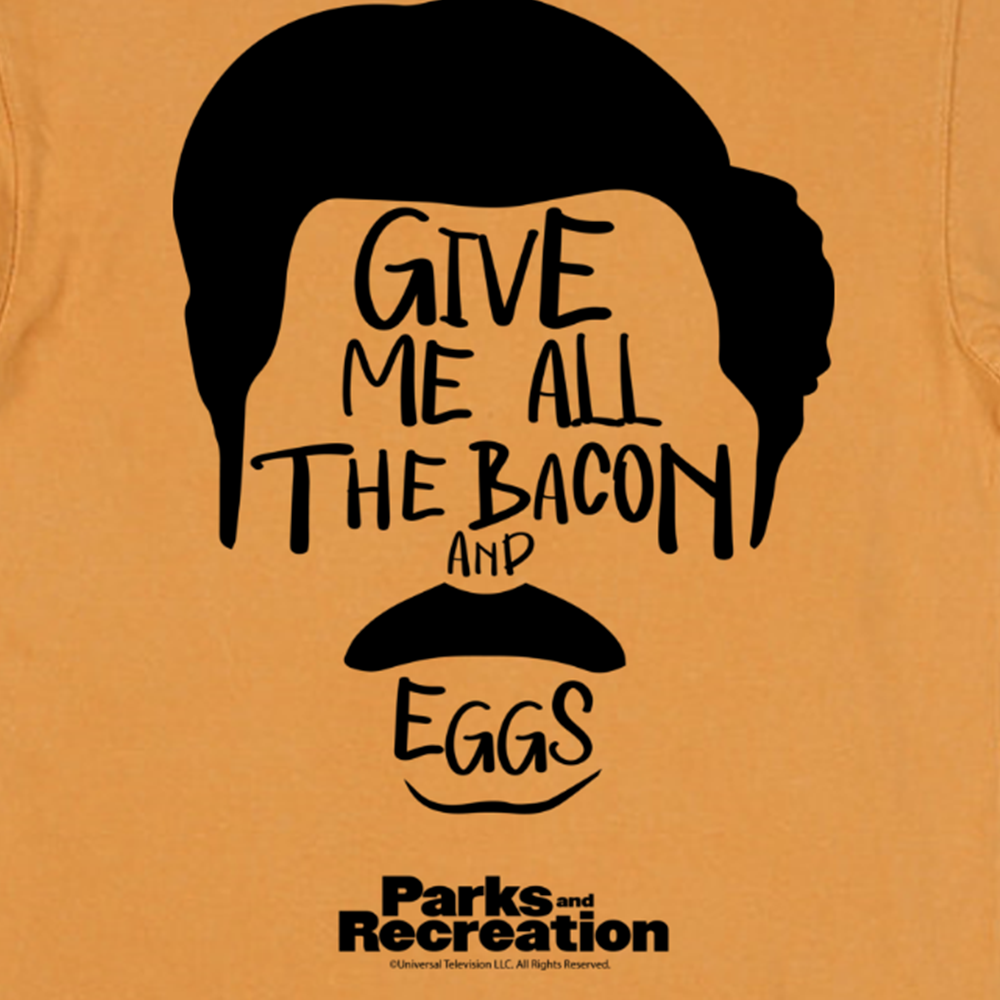 If you know what you're about when it comes to ordering breakfast food, then you will love wearing this Parks and Recreation Give Me All the Bacon and Eggs Distressed Short Sleeve T-Shirt. Inspired by Ron Swanson, this Parks and Recreation t-shirt lets people know that you don't just want a lot of bacon and eggs, but that you want all the bacon and eggs.