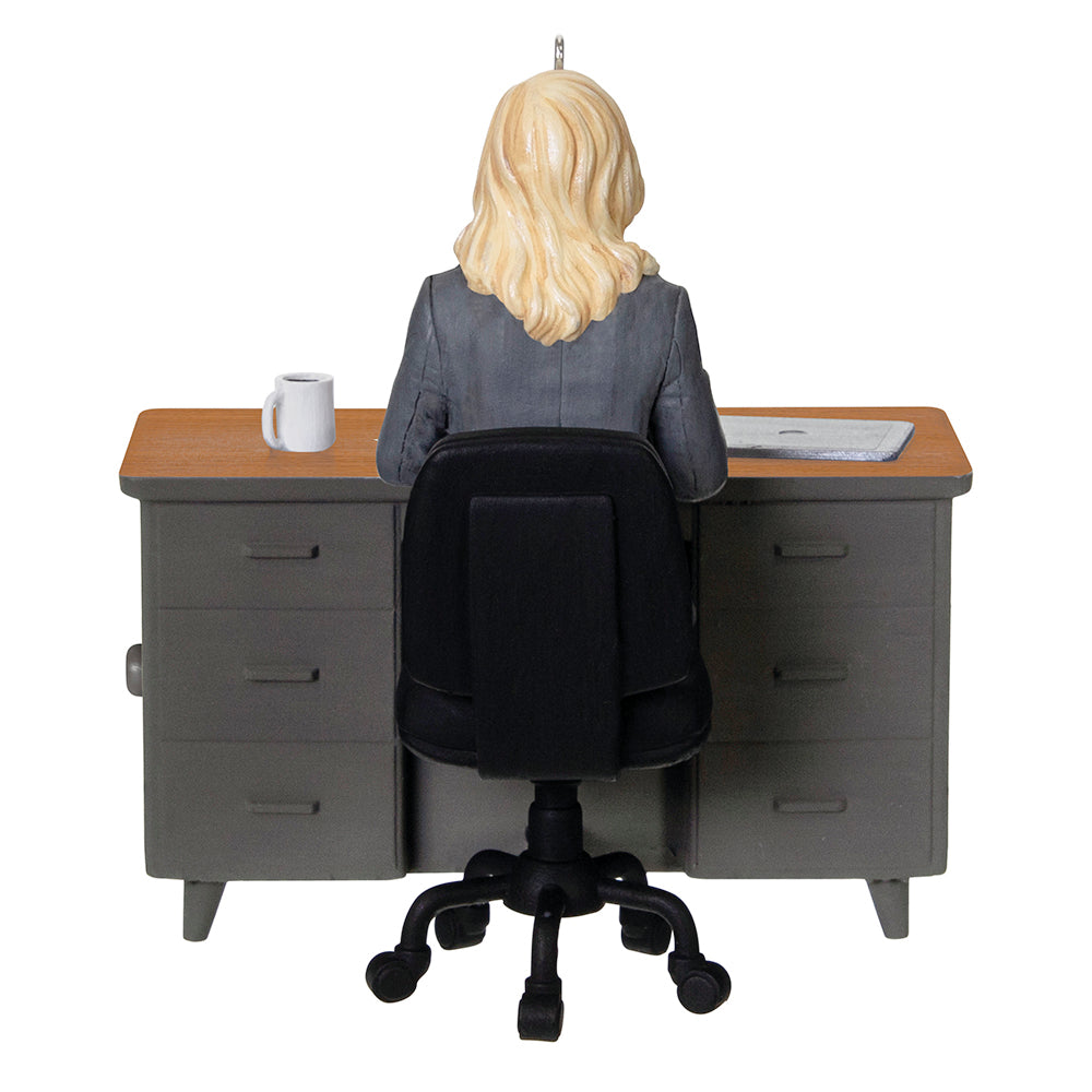 Enjoy a "Merry Congratu-Christmas" with this fun Christmas tree ornament featuring Leslie Knope from the TV show "Parks and Recreation." Press the button to hear iconic quotes from the optimistic, hard-working, waffle-loving, bureaucratic-red-tape-cutting Leslie as she sits behind her desk in the Parks & Rec department of fictional Pawnee, Indiana. Battery operated. With unparalleled artistry and exceptional detail, Hallmark Keepsake Christmas ornaments are perfect for preserving precious memories, commemorating special milestones and celebrating individual hobbies and interests.