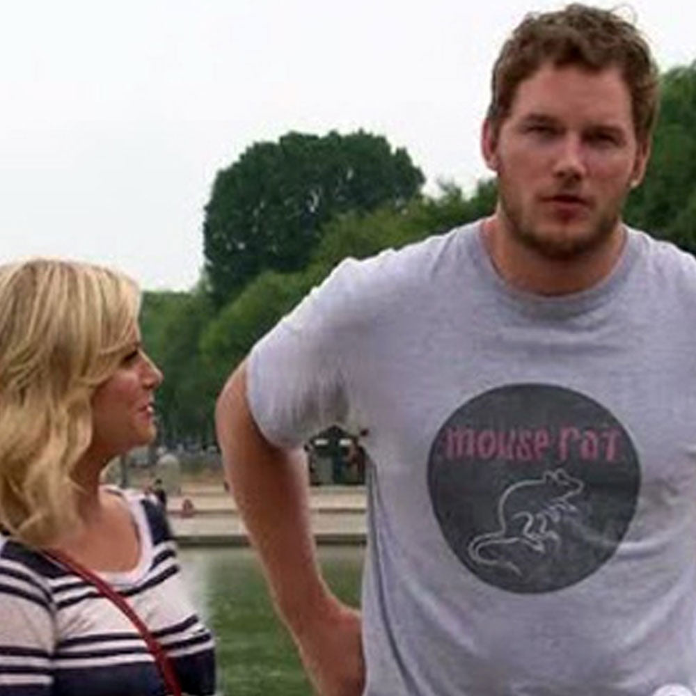 No matter what sweet play on words Andy and the band come up with like Scarecrow Boat Malice in Chains and Fiveskin they always return to Mouse Rat. Secure your place as a serious Mouse Rat fan with the Parks and Recreation Mouse Rat Circle T-Shirt. This gray tee features the Mouse Rat logo so it’s clear to fellow fans that you’re bordering on groupie. Seen on 9/20/12 - Season 5 Episode 1 Ms. Knope Goes to Washington