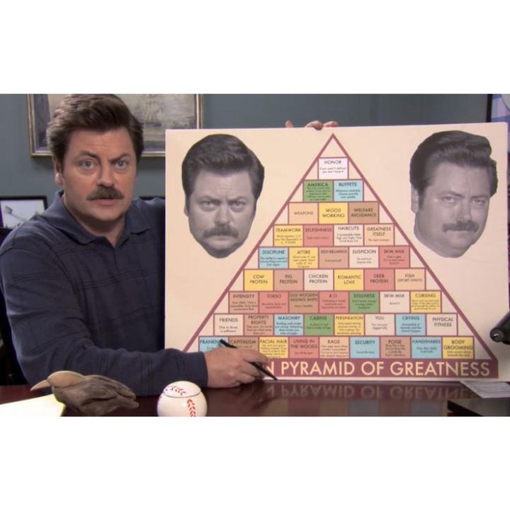 Boys turn into men, who turn into gladiators, who turn into Swansons under Ron’s watchful eye. From season three’s premiere, “Go Big or Go Home”, Ron Swanson’s Pyramid of Greatness is still a classic favorite.