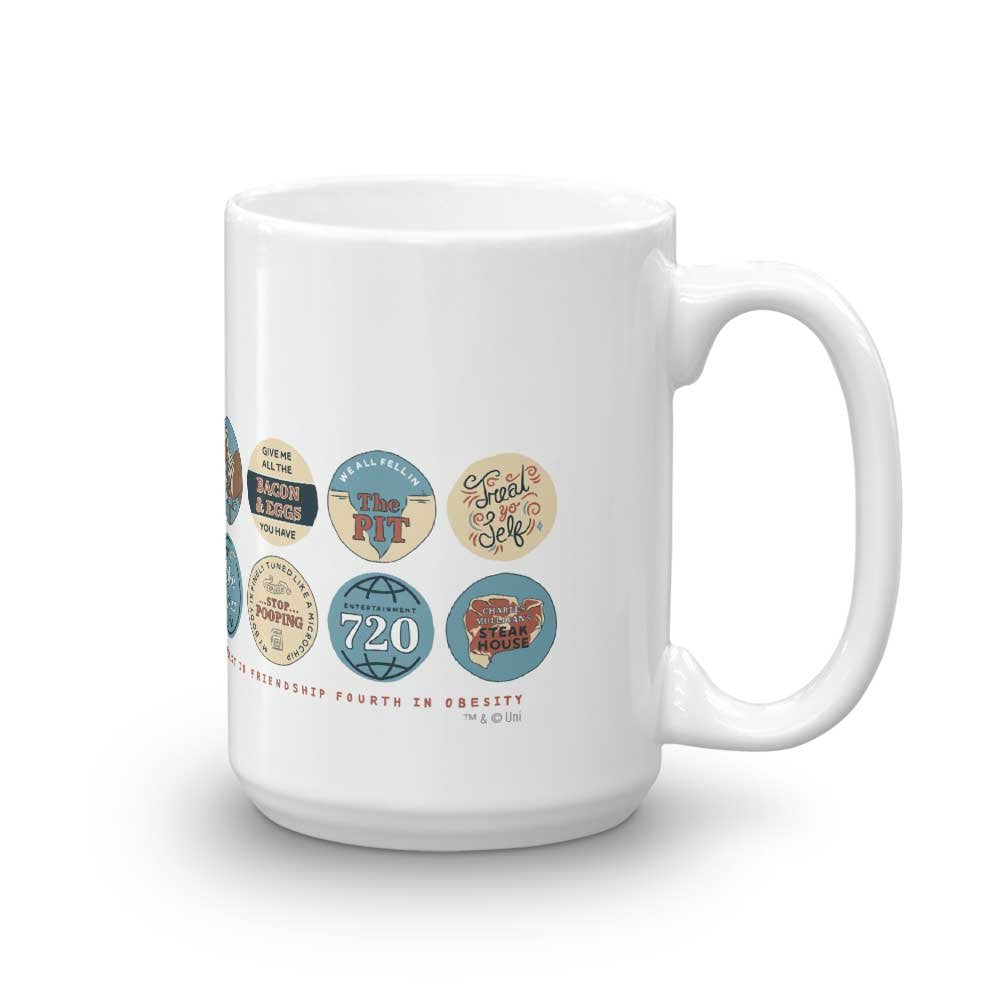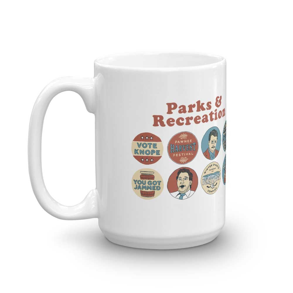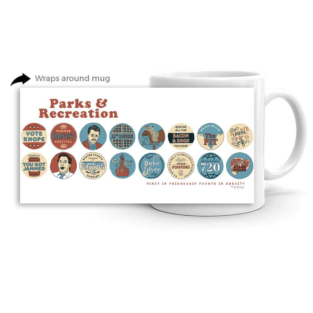 The Newest Version of the Parks and Recreation Quote Mash-up mug has arrived! This ceramic mug features some of the most memorable and hilarious quotes from the series. This design has all the quotes a die-hard fan could want including: You got Jammed Give me all the bacon and eggs you have Treat Yo Self and much more! With every sip from this mug you can take a trip back to Pawnee and relive your favorite moments from Parks and Recreation.The perfect size for your favorite morning beverage or late night brew. Large easy-grip handle. Treat yourself or give as a gift to someone special.