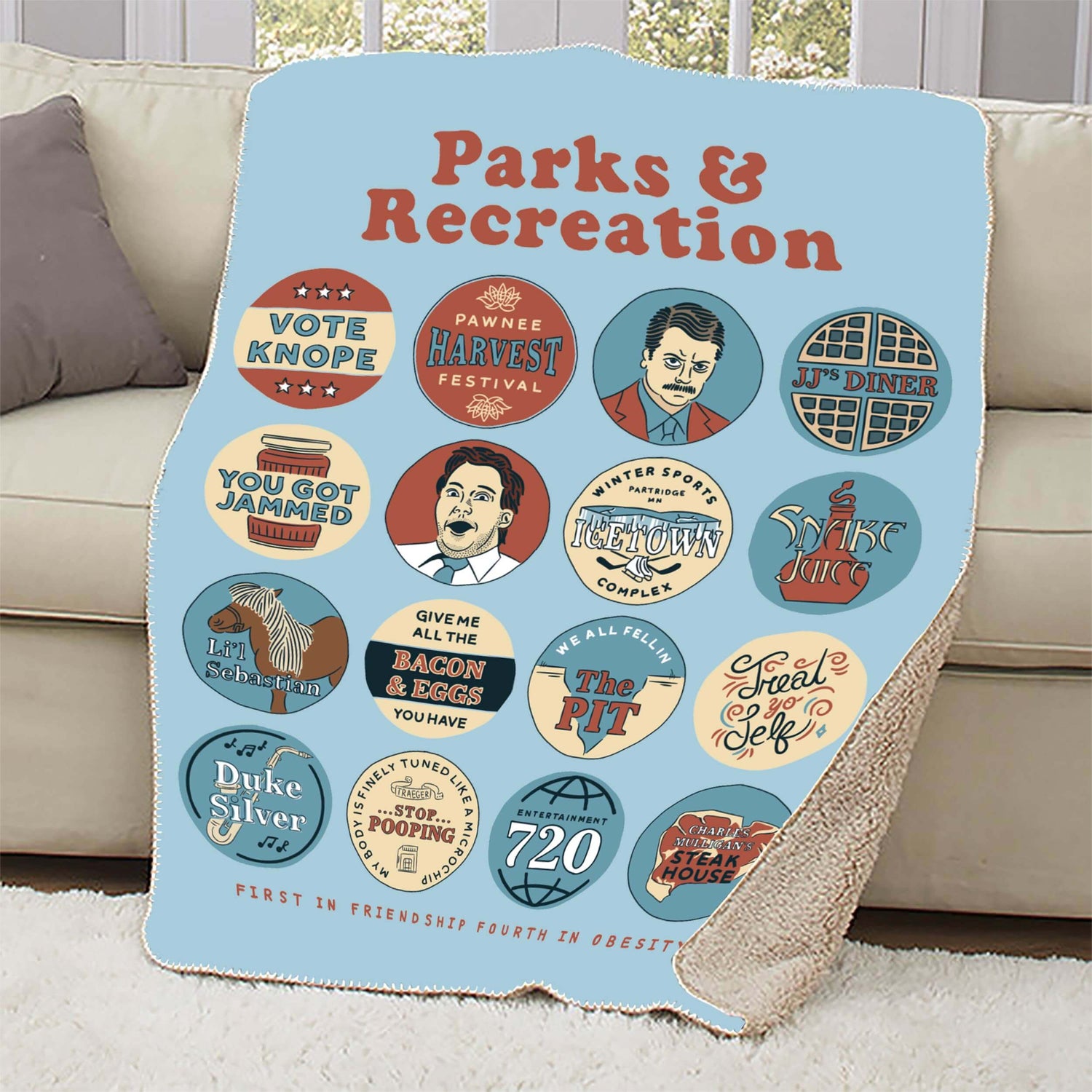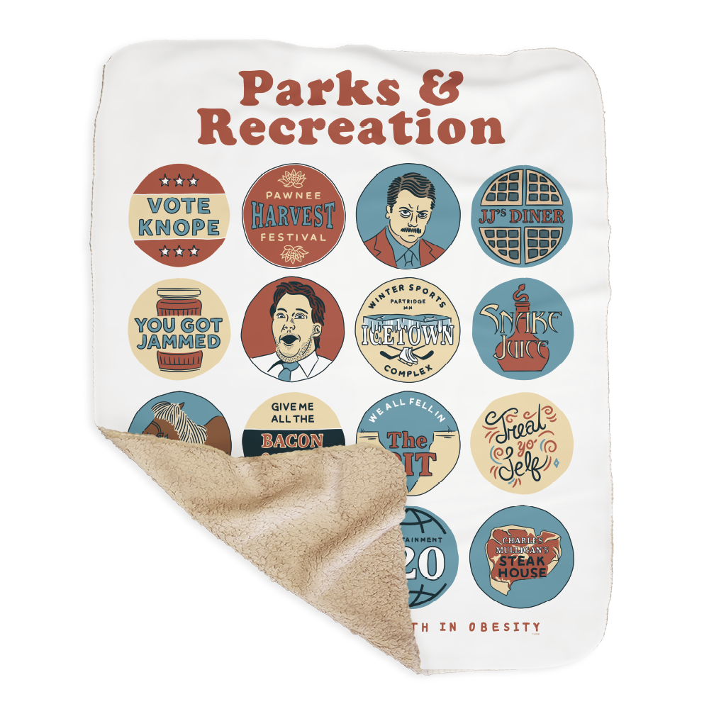 The Newest Version of Parks and Recreation Quote Mash-up blanket has arrived! This sherpa blanket features some of the most memorable and hilarious quotes from the series. This blanket has all the quotes a die-hard fan could want including: You got Jammed Give me all the bacon and eggs you have Treat Yo Self and much more! Stay warm take a trip back to Pawnee and relive your favorite moments from Parks and Recreation with this super soft sherpa blanket!PRODUCT DETAILS: