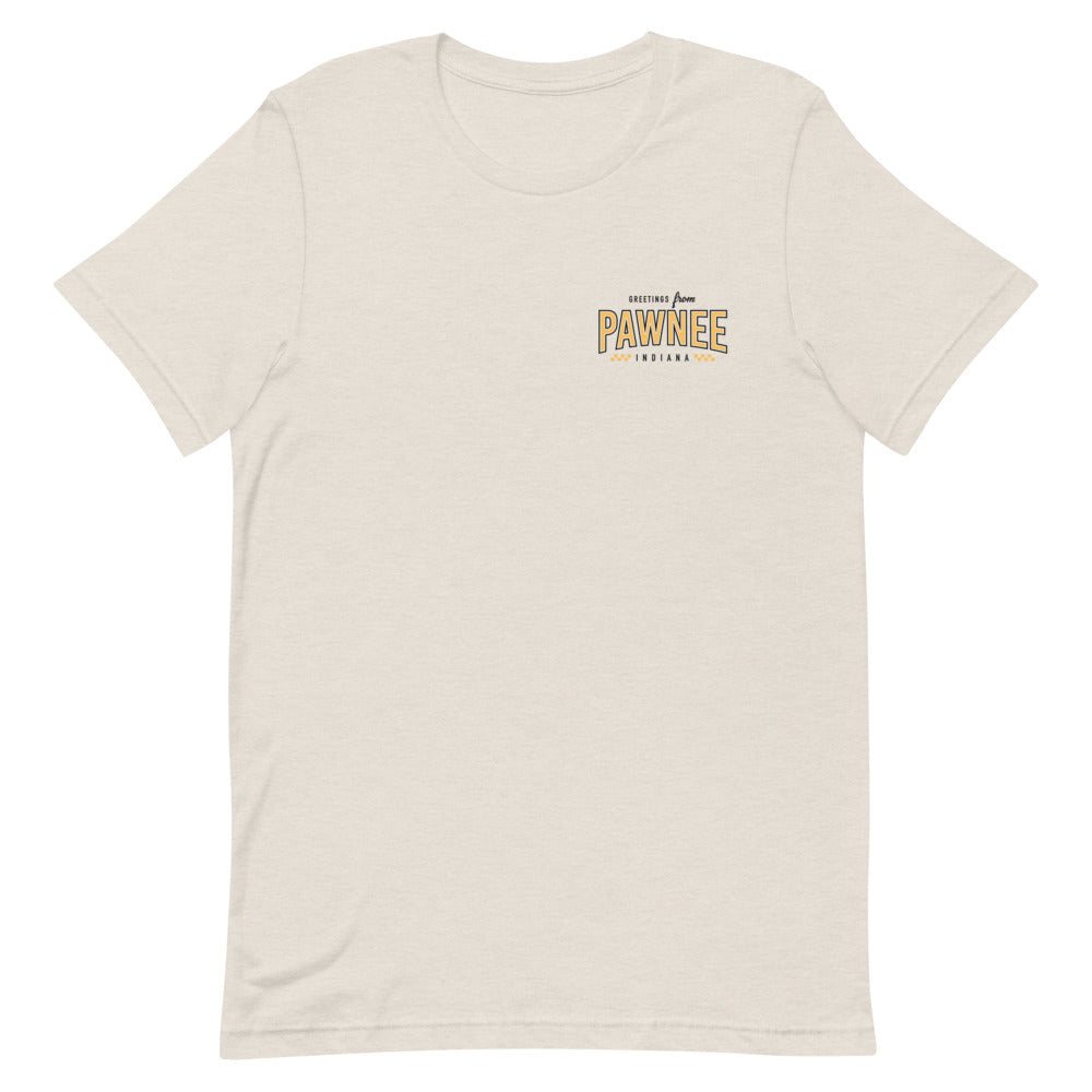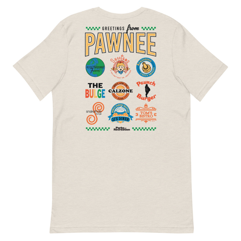 Celebrate your love for the beloved TV show Parks and Recreation with our exclusive unisex t-shirt featuring the iconic restaurants of Pawnee.