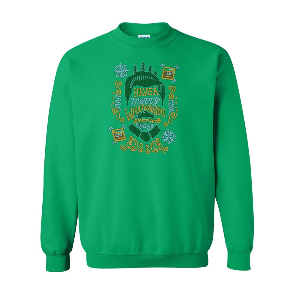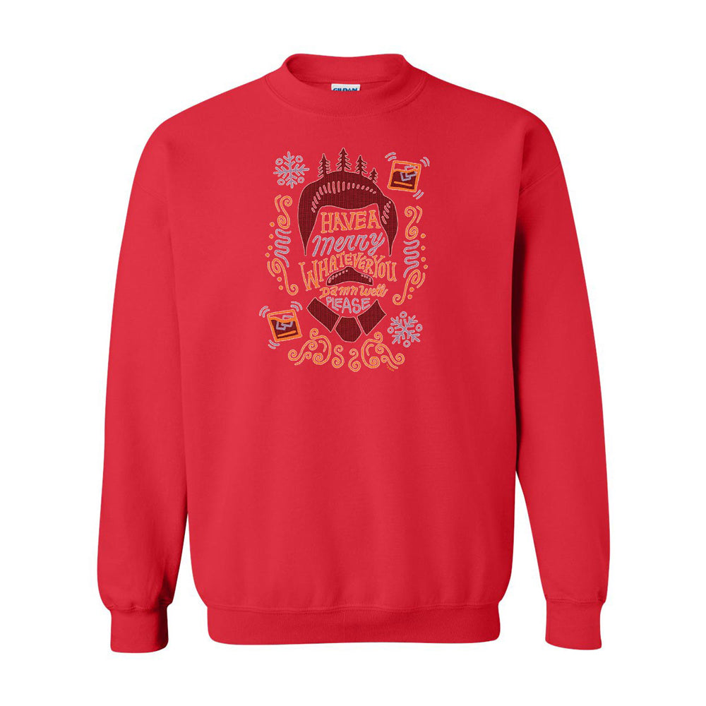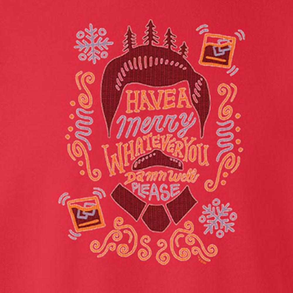 Searching for a funny ugly Christmas sweater for your Holiday parties this year? Look no further! This hilarious Ron Swanson crew neck sweatshirt features an outline of Ron’s face with the quote “Have a Merry Whatever You Damn Well Please” on the front. This comfy Christmas sweatshirt is perfect for any fan of Parks and Recreation and guarantees laughter.
