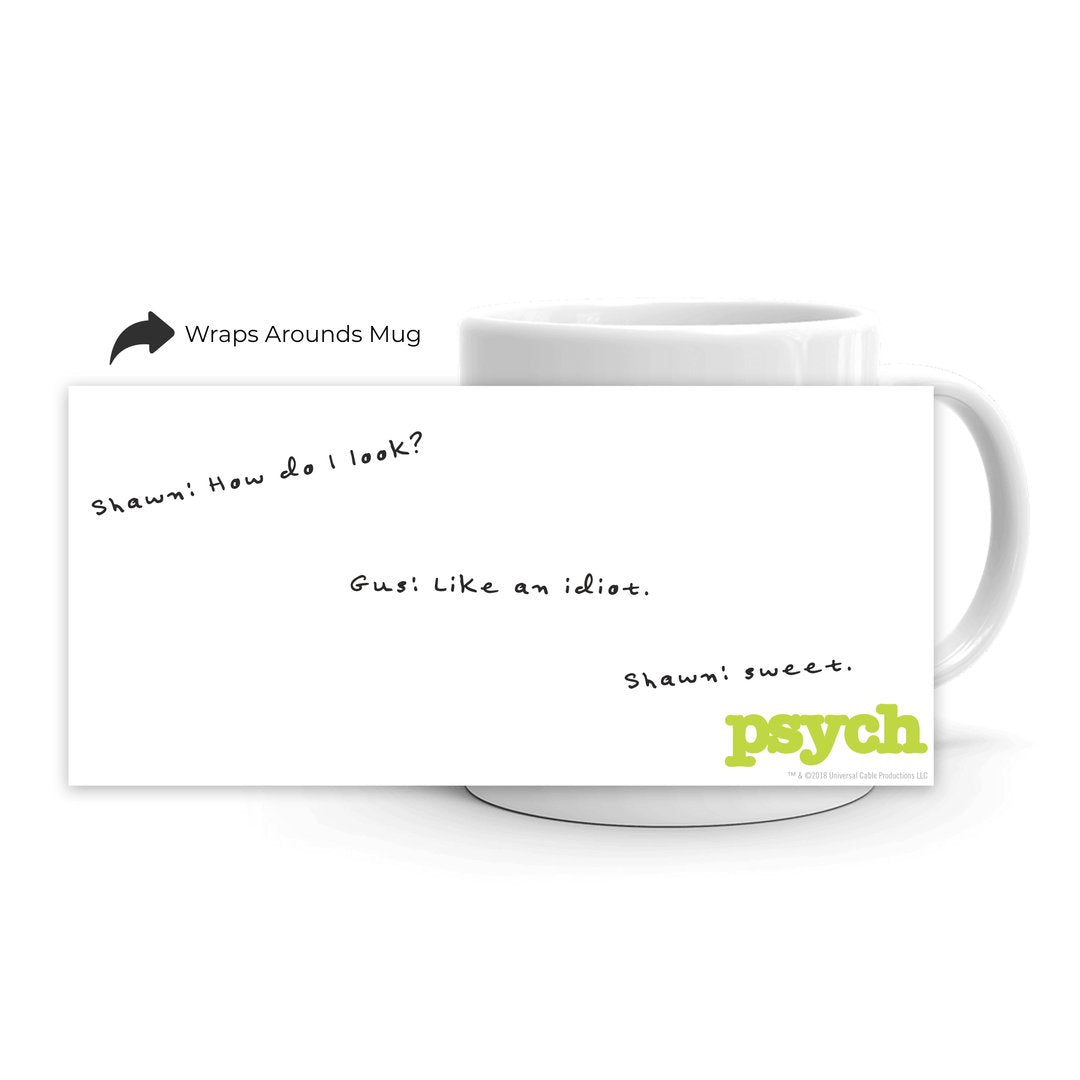 Get this hilarious ceramic mug featuring the conversation before Shawn and Gus on "How do I look?" This classic white mug is perfect for any Psych Fan.