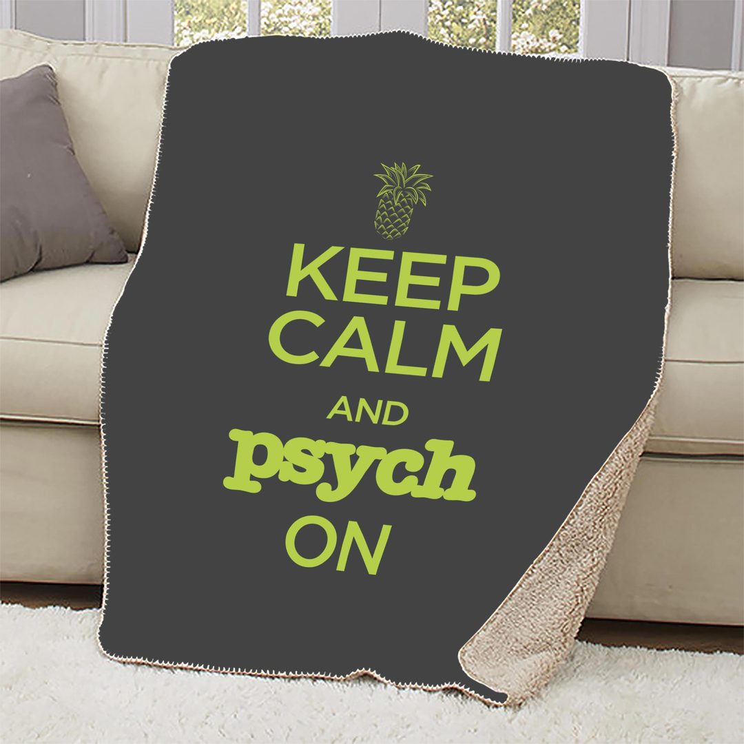 Binge watch all of your favorite Psych episodes and snuggle up with this super soft sherpa blanket. This blanket features "Keep Calm and Psych On" on the front so you don't have to explain to anyone why you are lounging around and watching Psych.