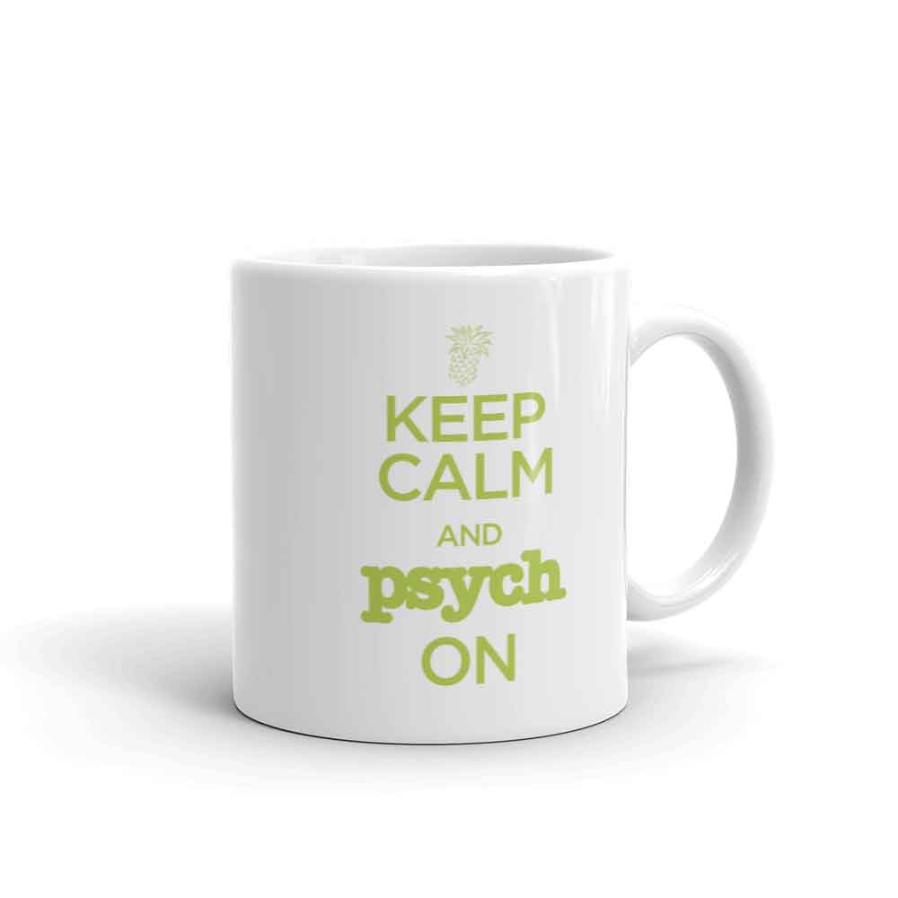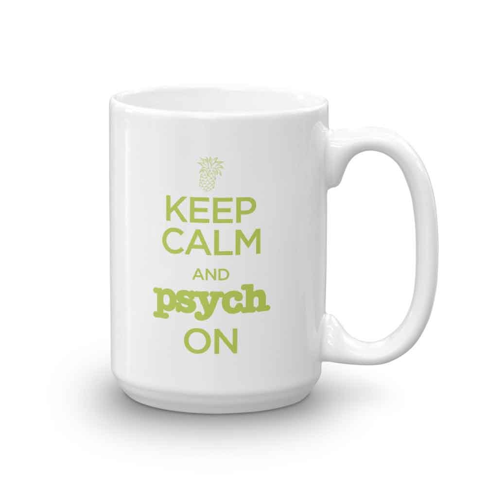 Whether it's 6 in the morning or 6 at night you can keep calm with this classic ceramic mug. The white mug features the saying "Keep Calm and Psych On" making it a great gift for any Psych fan.