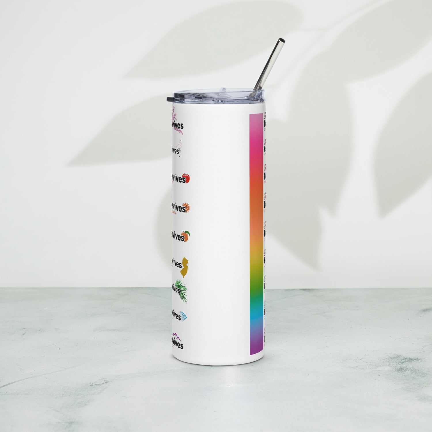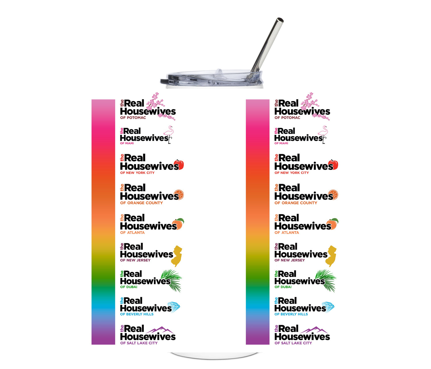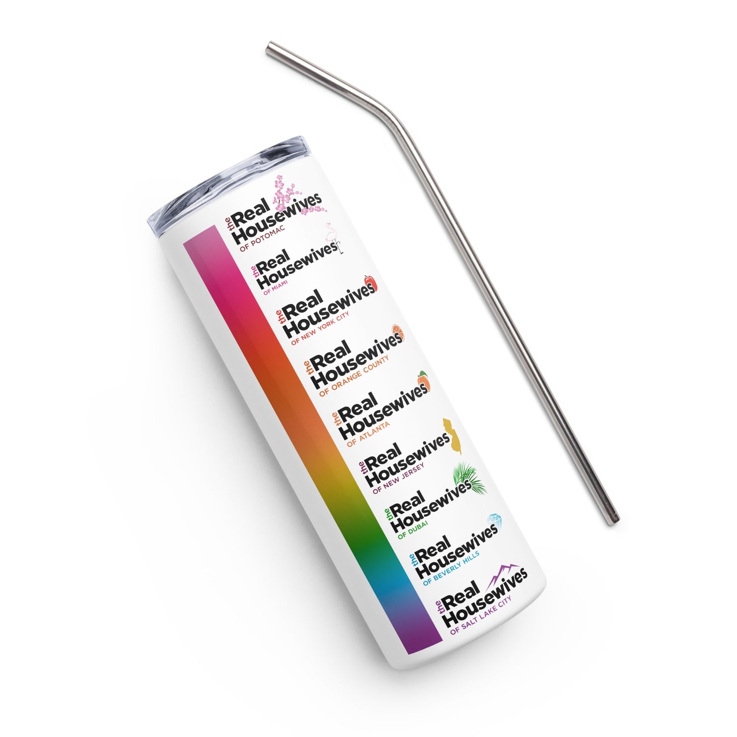 The Rainbow Real Housewives Skinny Tumbler is a stylish and practical drinkware accessory that combines functionality with a vibrant design inspired by the popular reality TV franchise. This production description provides an overview of this eye-catching tumbler, highlighting its design, features, and appeal for fans of the Real Housewives series.