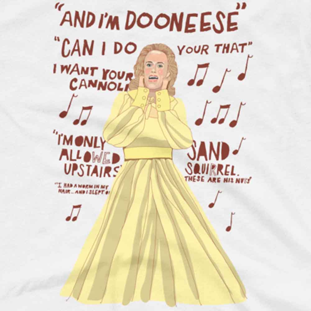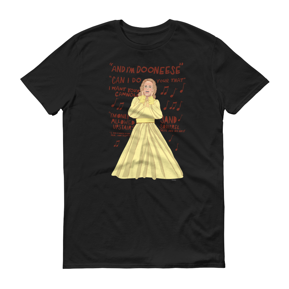 She has a big forehead and small hands but she's Dooneese! Love Dooneese even more when you wear this short sleeve t-shirt with Dooneese and some of her and her sisters’ most popular song lyrics on the front.This shirt features short set-in sleeves and a seamless rib knit collar. There are taped neck and shoulder seams for durability and two-needle hemmed sleeves so the bottom won't unravel.