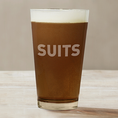 Channel Team Harvey's wins while you drink your favorite frosty beverage out of this official Suits Pint Glass. The 16 ounce glass has the logo engraved across the front of the glass.