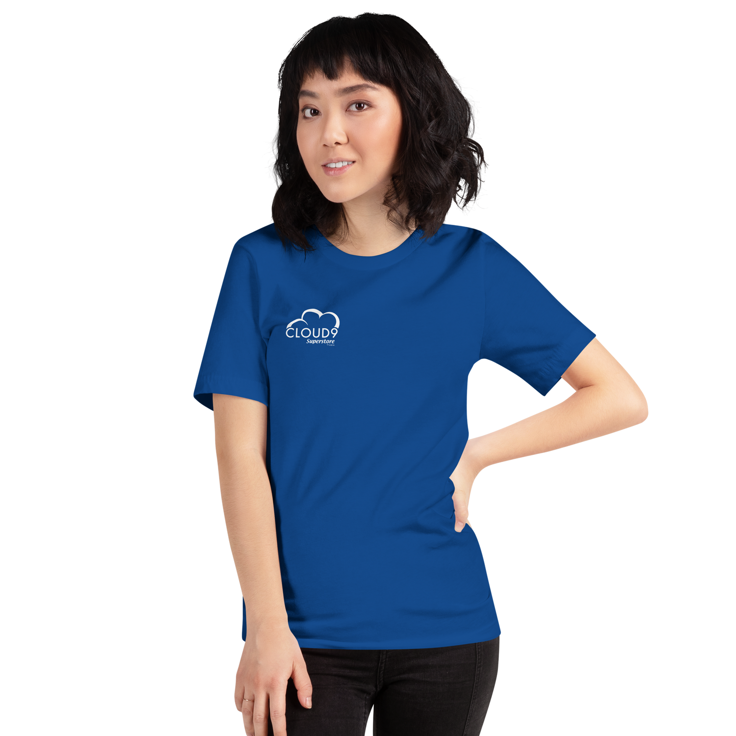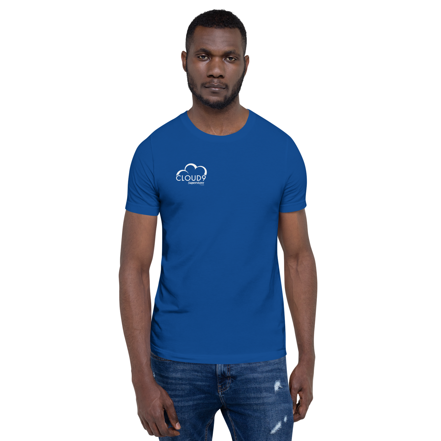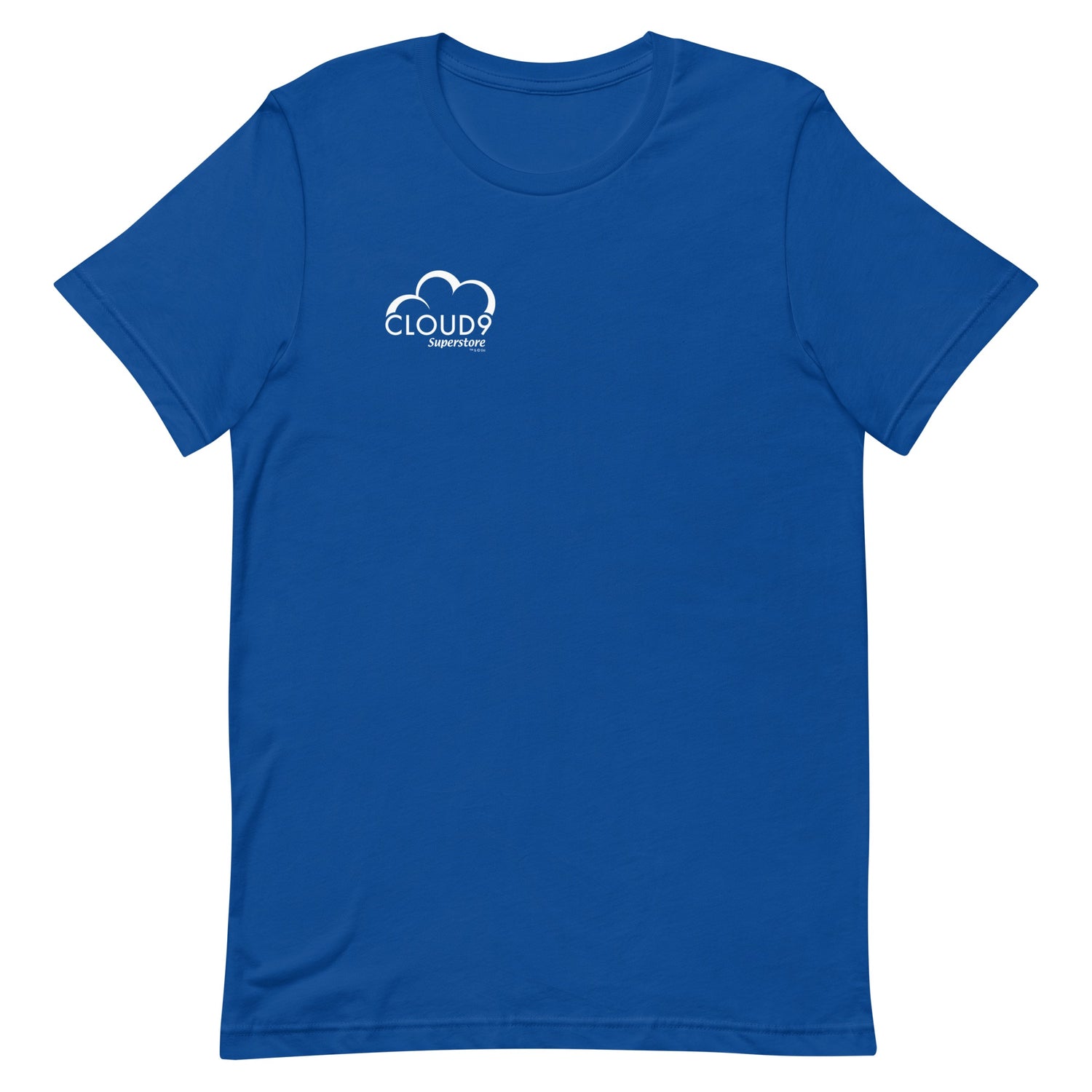 You'll look SUPER official when you put on this Superstore men's tee with the Cloud 9 logo on the upper right corner.This shirt features short set-in sleeves and a seamless rib knit collar. There are taped neck and shoulder seams for durability and two-needle hemmed sleeves so the bottom won't unravel.