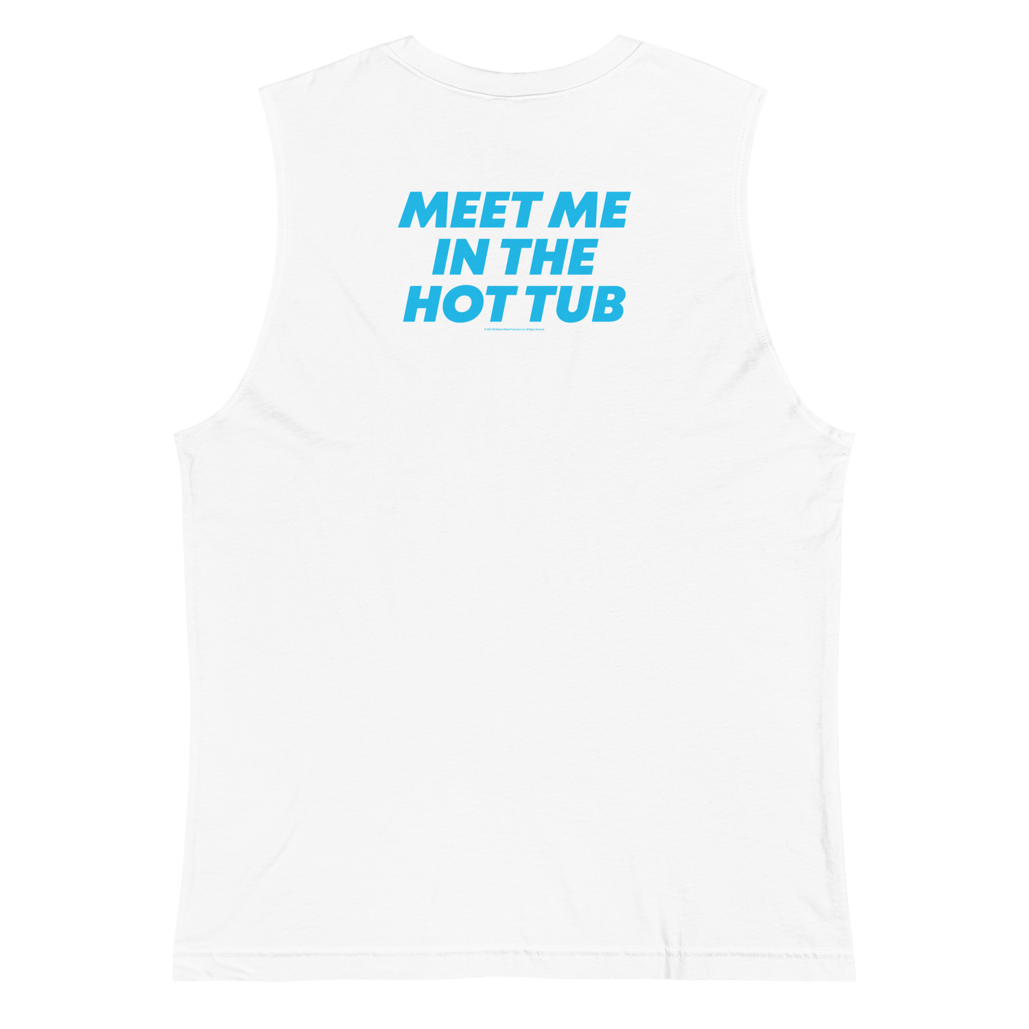 When you're not taking a steamy hot dip, slip into this comfy Temptation Island Meet Me In The Hottub Tank Top. This unisex muscle shirt comes in white with baby-blue print, and a hot-pink Temptation Island logo on the front corner.