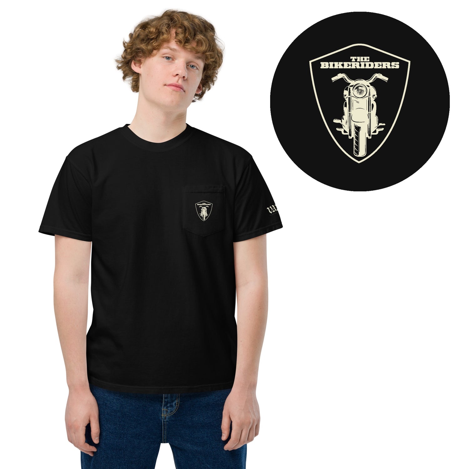 Rev up your style with The Bikeriders Crest Comfort Colors Pocket T-Shirt, inspired by the adrenaline-fueled world of The Vandals, a fictitious bike club featured in the summer blockbuster film. The tee includes a custom bike logo on the pocket, along with Vandals branding on the sleeve.