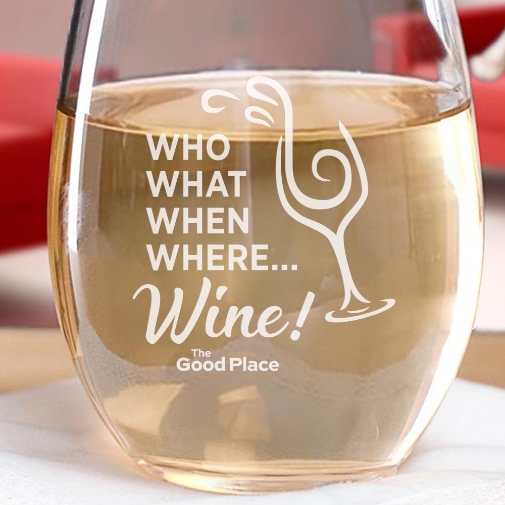 The Good Place Who, What, When, Where, Wine Laser Engraved Stemless Wine Glass