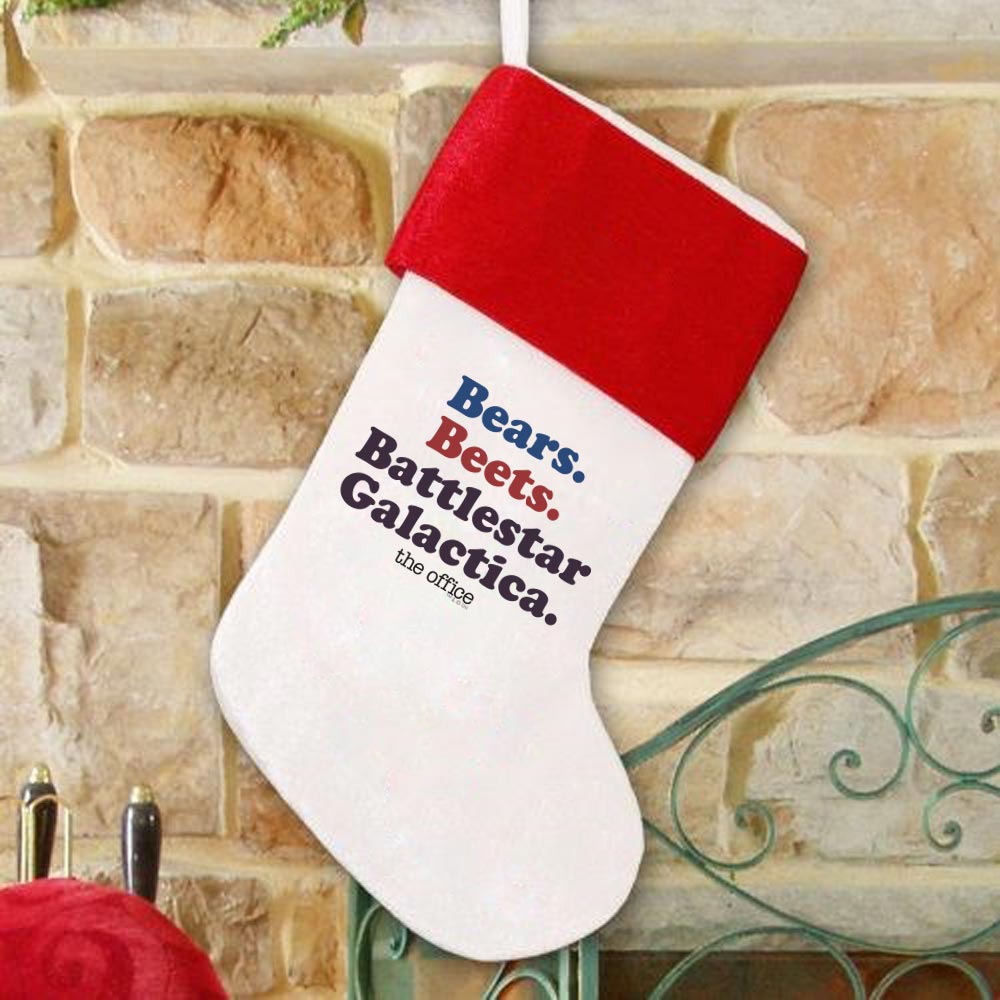Dwight and Jim have an on going prank battle and it doesn’t have to stop just because the holidays are here. In the infamous prank where Jim decides to act like Dwight with the line “Bears. Beets. Battlestar Galactica” is an Office classic. The Office Bears Beets Battlestar Galactica is exactly what you need this winter. Great for gifting get this for yourself and fellow Office fans today!- Add some holiday cheer to your mantle this year with stocking representing your favorite NBC show!