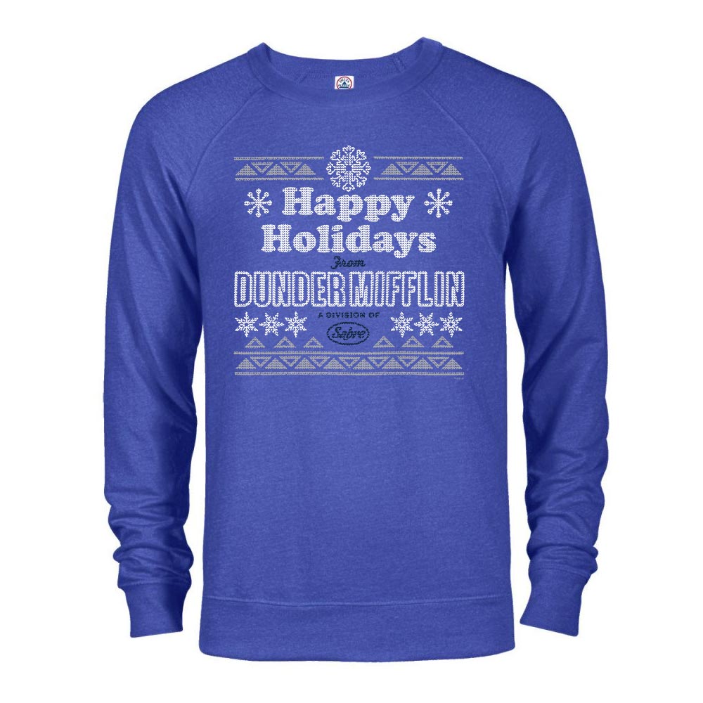 Searching for a funny ugly Christmas sweater for your Holiday parties this year? Look no further! This Dunder Mifflin lightweight crew neck sweatshirt features Happy Holidays from Dunder MIfflin on the front. This comfy Christmas sweatshirt is perfect for any fan of The Office and guarantees laughter from friends and family alike.