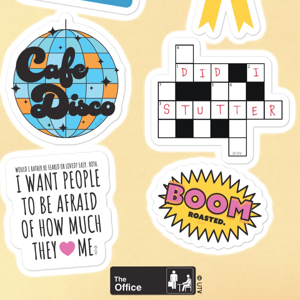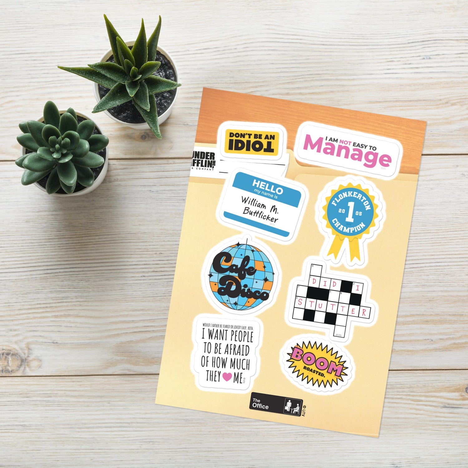 Decorate your belongings with the iconic symbols of The Office using our Icons Sticker Sheet. Featuring quirky quotes from the memorable characters along with iconic office items, this sticker sheet is a must-have for any fan of the show. Whether you're adorning your laptop, water bottle, or notebook, let these stickers showcase your love for the Dunder Mifflin crew wherever you go!