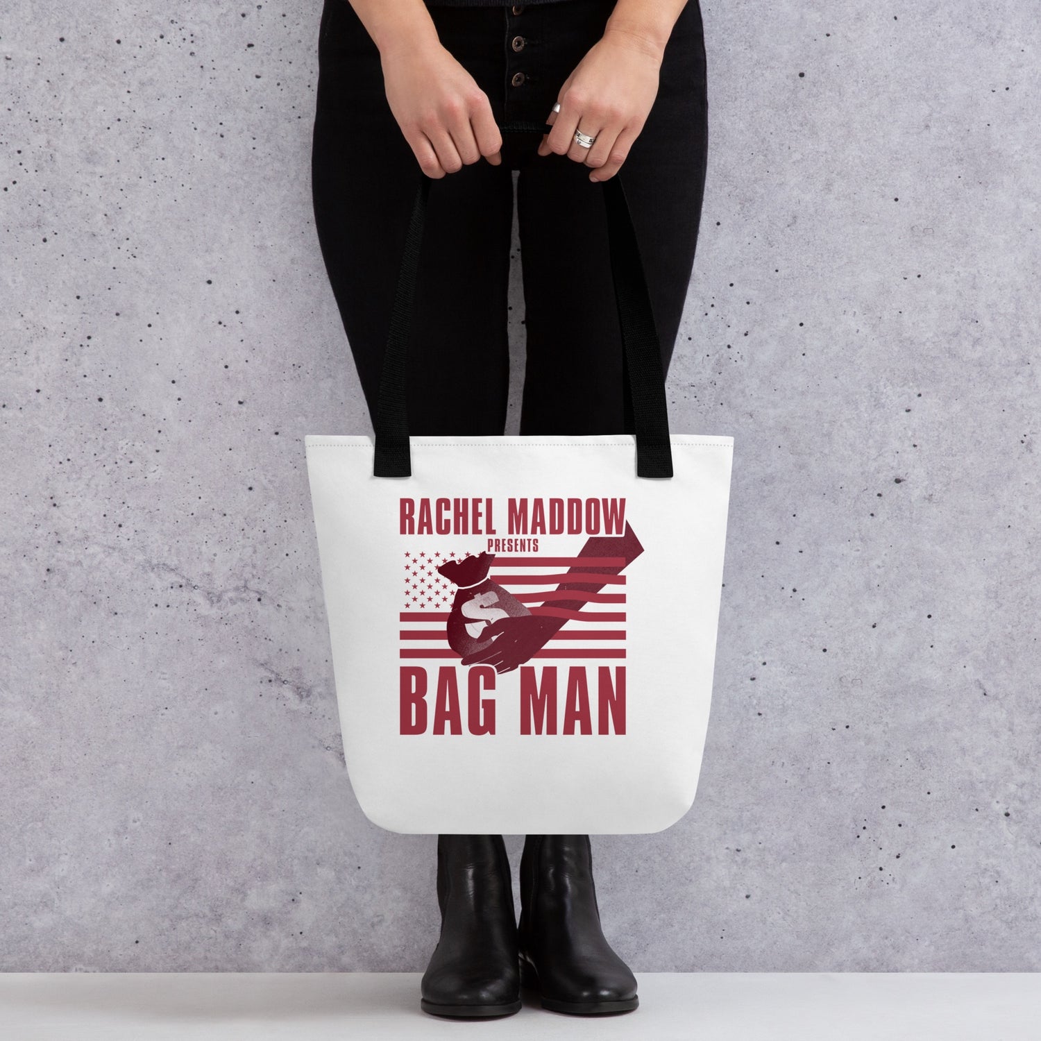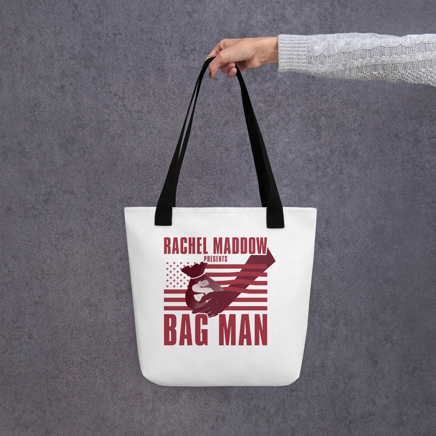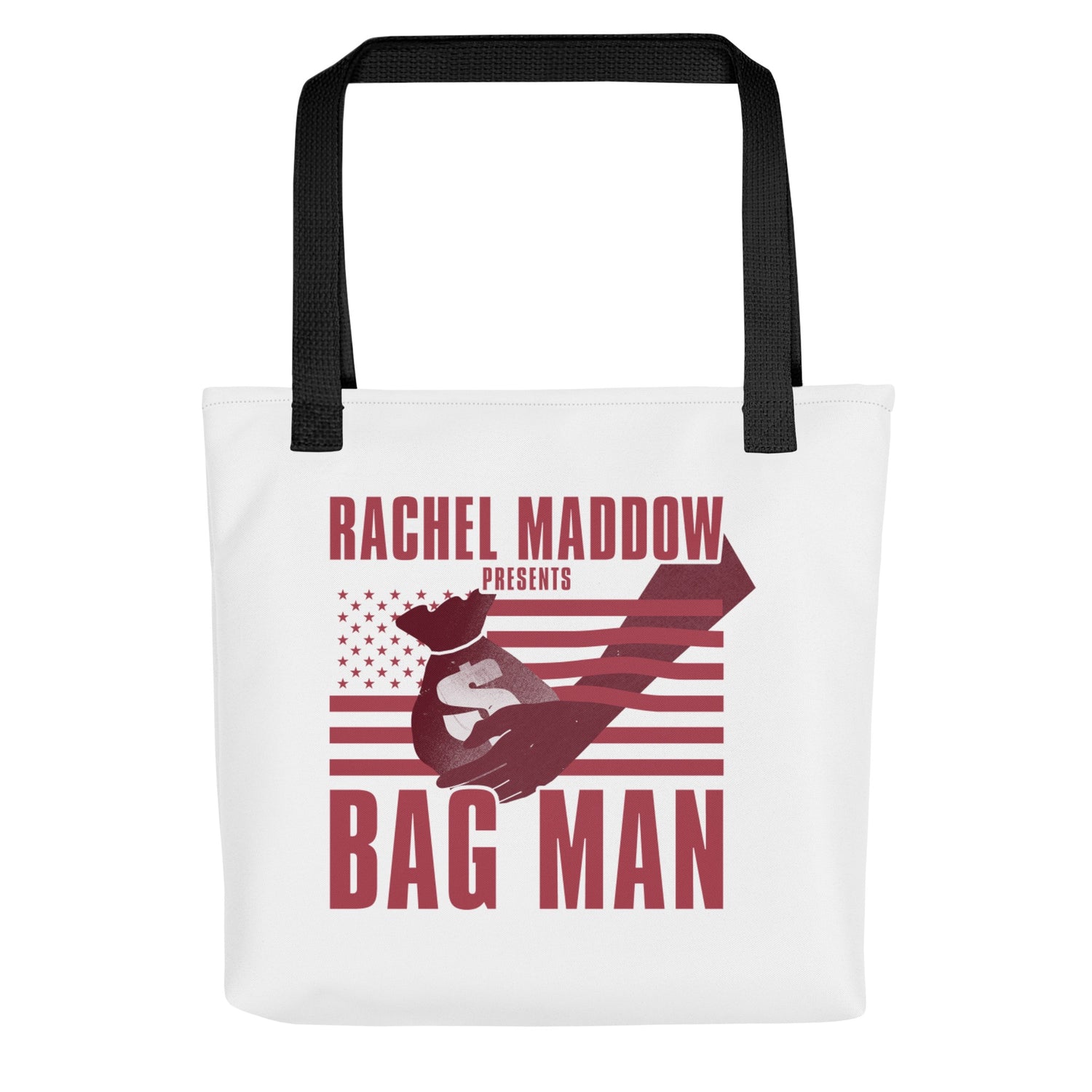 This spacious Bag Man Tote Bag from The Rachel Maddow Show is the perfect accessory for anyone who listens to the podcast. With a durable build and spacious interior, this tote bag is perfect for work, school, grocery shopping, the gym, and daily use.