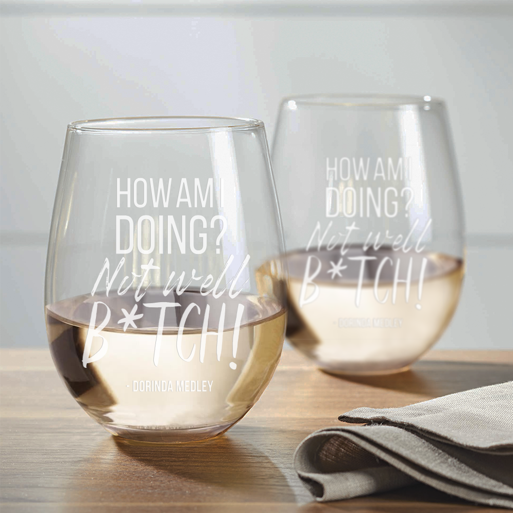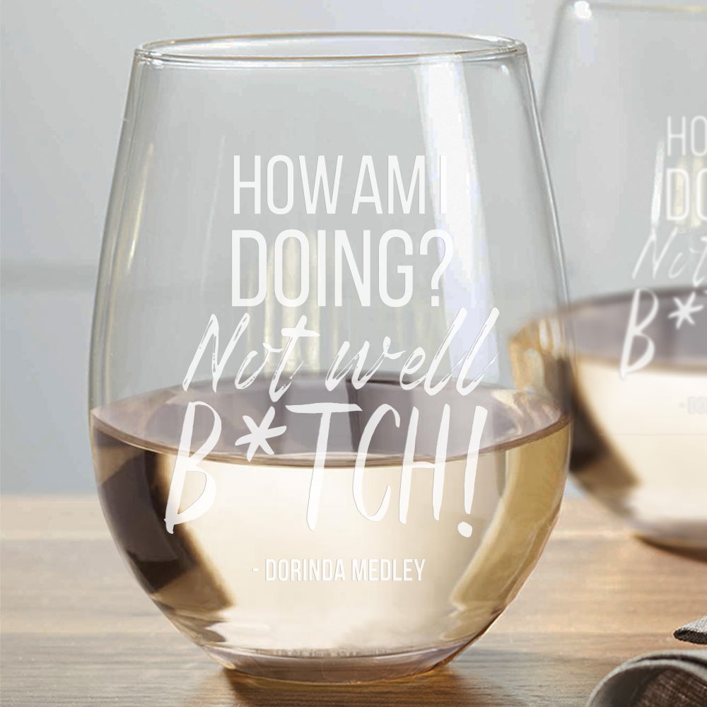 Dorinda, from The Real Housewives of New York City, is not afraid to tell it like it is. Take a little bit of Dorinda home with these ""How am I Doing?"" stemless wine glasses. Sip your favorite wine, and when people ask you how you're doing, channel your inner Dorinda. These wine glasses are perfect for nights in watching Bravo, get yours today!