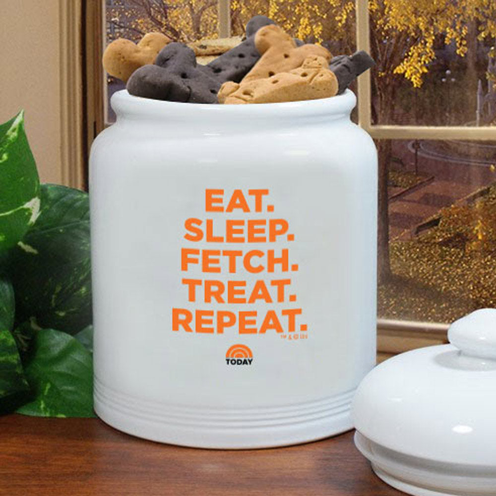 Embrace the dog lifestyle when you buy this exclusive TODAY dog treat jar! Eat. Sleep. Fetch. Treat. Repeat. When filled with your dog's favorite treats this jar is sure to keep their eyes glowing and their tail wagging.