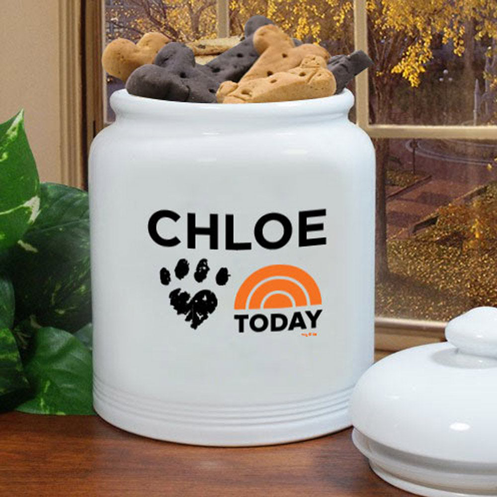Get your pup this cute jar to hold all of their favorite treats! Personalize this jar with your dog's name to make this treat jar extra special. Featuring the TODAY logo printed next to a cute paw print this treat jar is sure to be your dog's favorite thing in the house.
