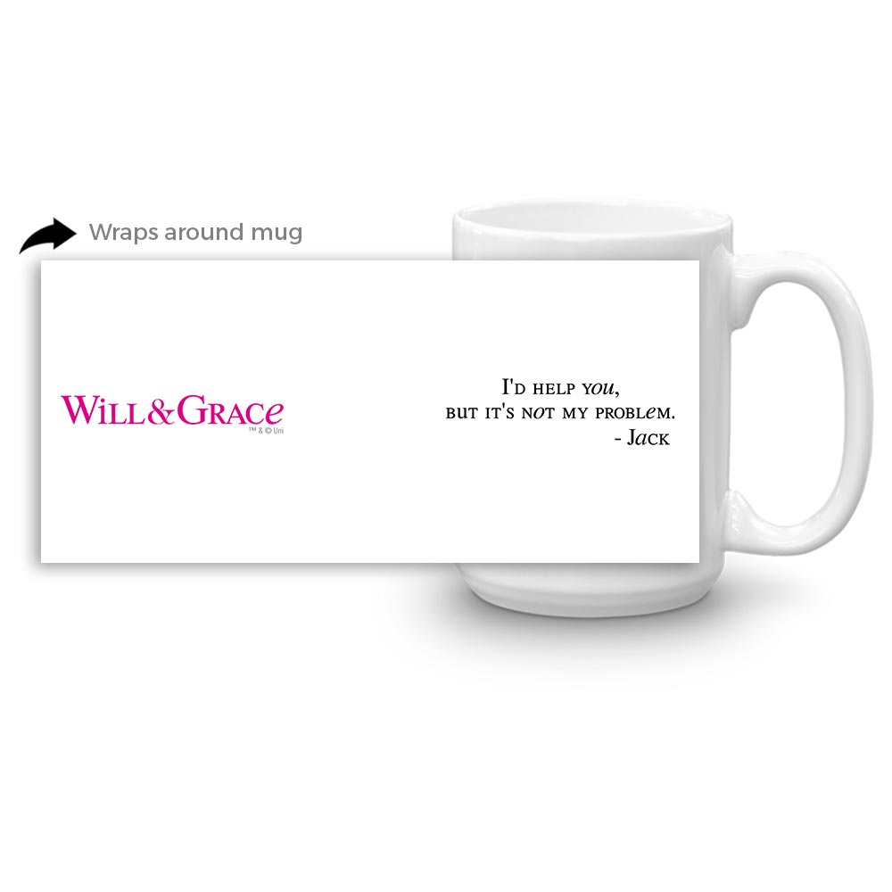 Jack's lovable self-centeredness is exemplified on this I'd help you but it's not my problem mug. This ceramic mug has a large easy grip handle and features Jack's quote on one side and the Will & Grace logo on the other.